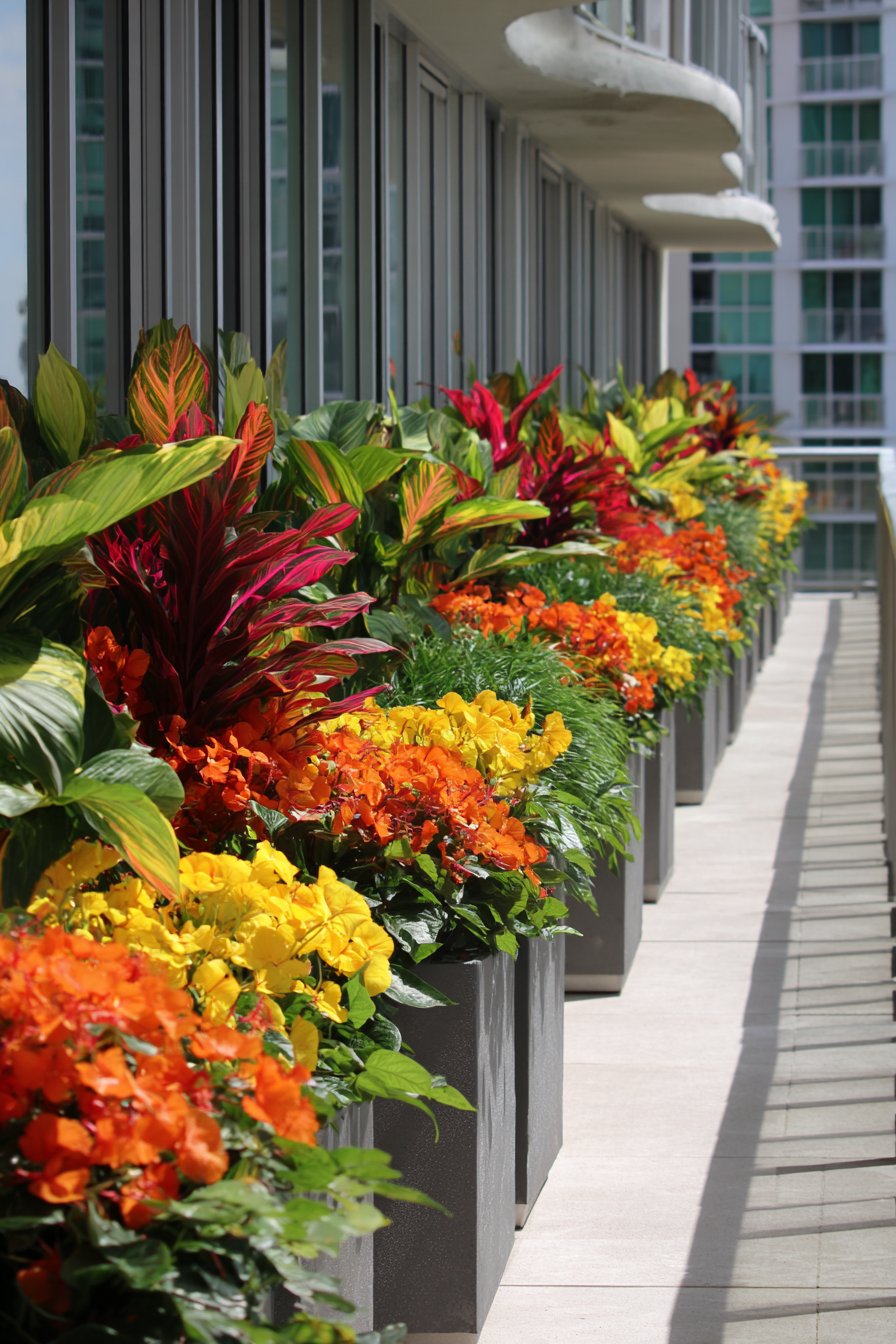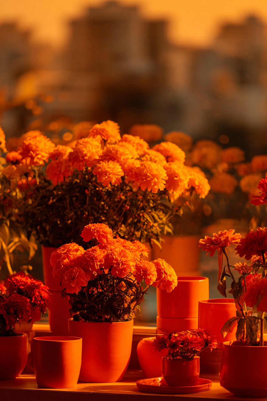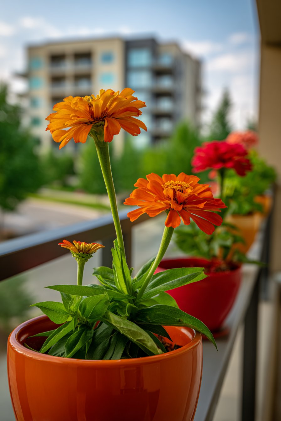 Color theory comes alive in this dramatic balcony flower idea celebrating warm tones through carefully selected flowers in orange, golden yellow, coral, and red. Marigolds, rudbeckia, zinnias, and salvia planted in coordinating burnt orange ceramic containers create energizing visual impact that complements and intensifies during evening golden hour lighting. The vibrant warm palette creates psychological warmth and cheerfulness, literally brightening the outdoor space while emotionally uplifting its occupants.