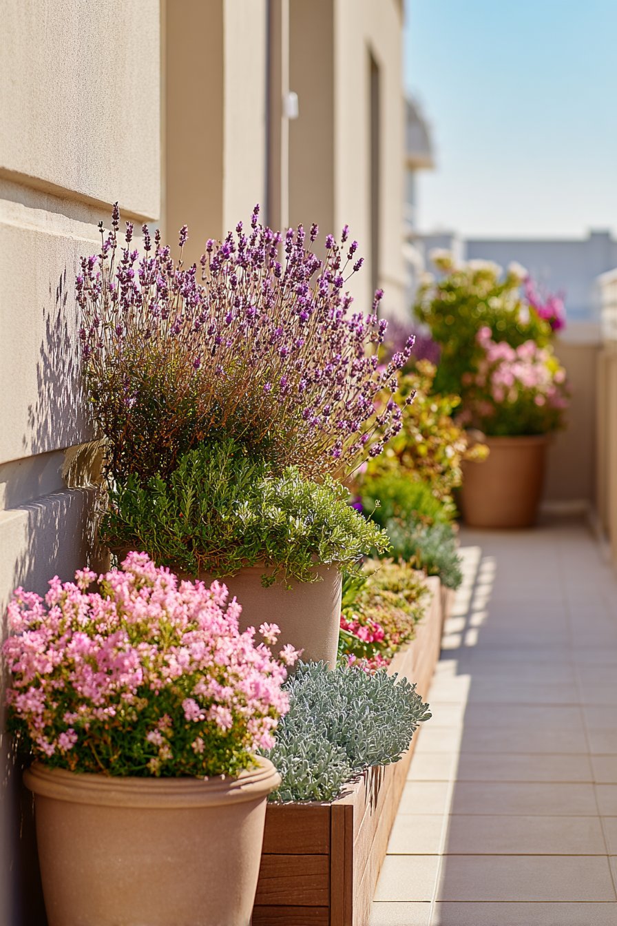 The warm, sun-drenched aesthetic of the Mediterranean comes alive in this balcony flower idea showcasing traditional terracotta pots filled with vibrant bougainvillea, fragrant rosemary, and cascading geraniums. The natural clay containers in various sizes create visual rhythm while providing the excellent drainage and air circulation that Mediterranean plants demand. This arrangement transports you to a Tuscan villa or Greek island retreat, proving that thoughtful plant and container selection can evoke powerful sense of place.