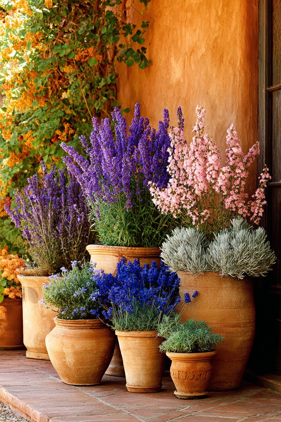 - Vary container heights by using plant stands, inverted pots, or wooden crates as risers