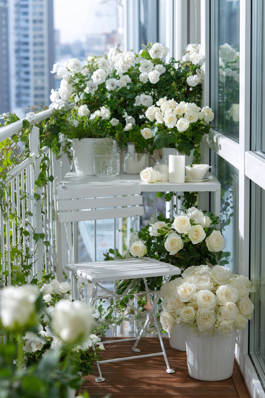 This arrangement demonstrates how balcony gardens can create outdoor rooms for specific purposes rather than simply displaying plants. The integration of furniture with planting creates a functional space that invites use—morning coffee, afternoon reading, evening wine—while the surrounding flowers enhance the experience with beauty and fragrance. This approach maximizes the value of limited balcony space by making it genuinely livable rather than merely decorative.