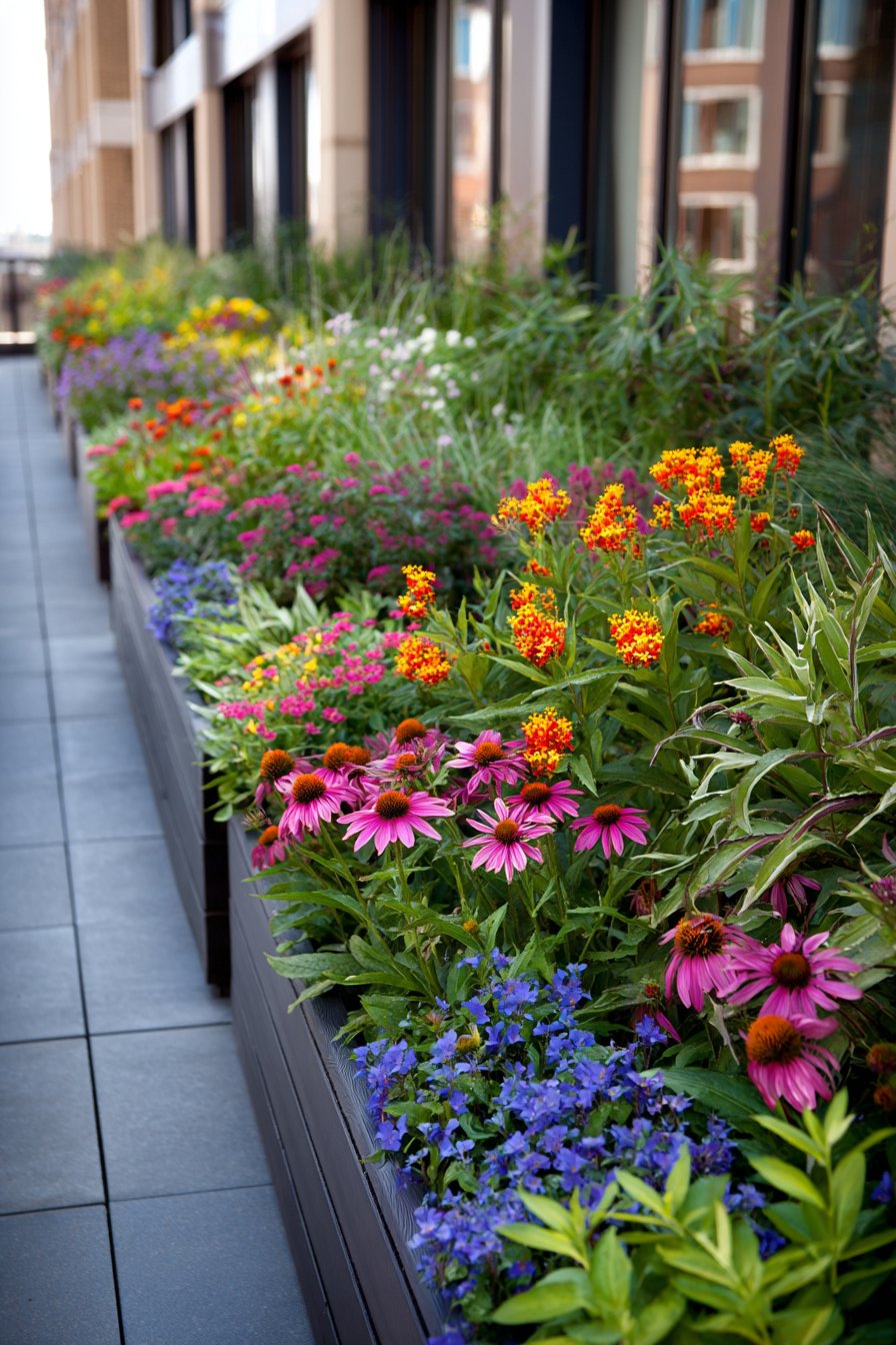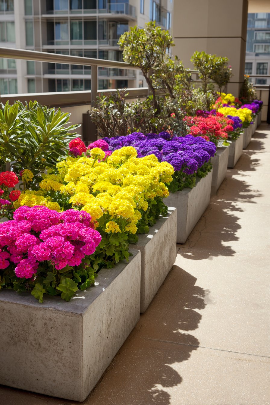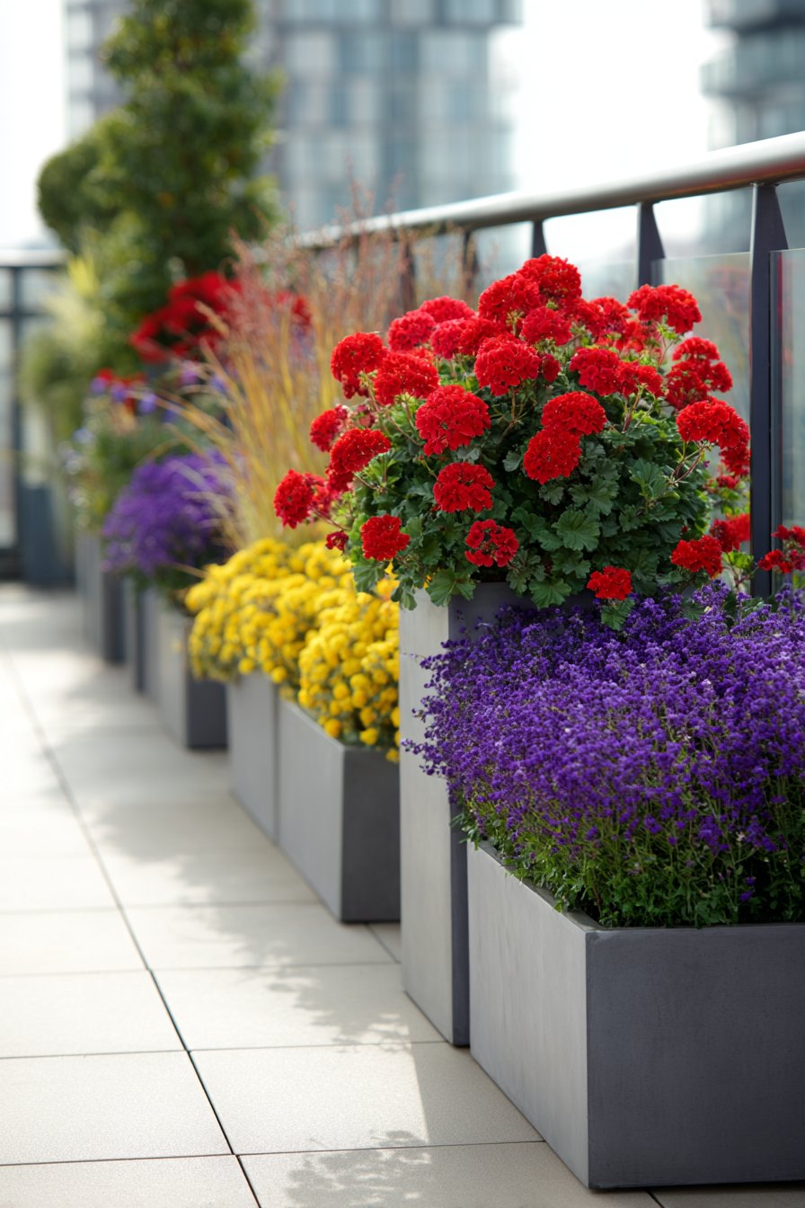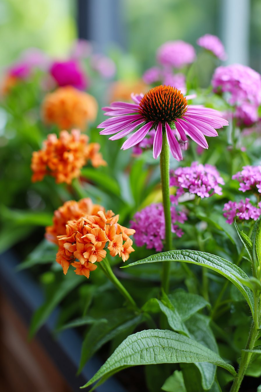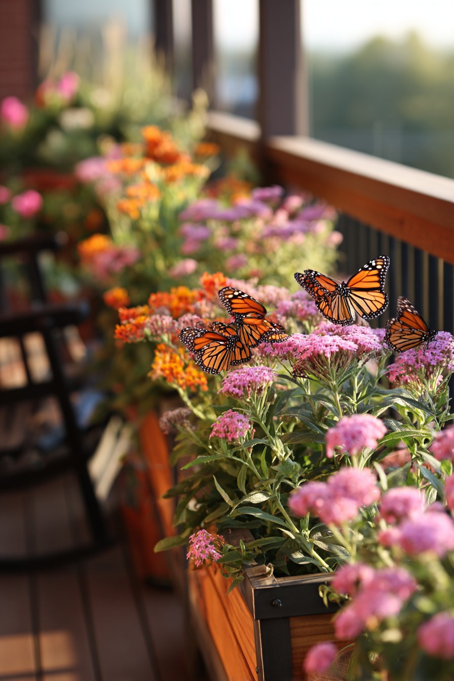 Environmental consciousness meets aesthetic beauty in this balcony flower idea designed specifically to attract and support pollinators. Purple coneflowers, orange butterfly weed, and pink verbena fill deep rectangular planters with proper drainage, creating a buzzing, living ecosystem that contributes to urban biodiversity. This approach demonstrates how even small balcony gardens can make meaningful environmental contributions while providing the gardener with the joy of observing visiting butterflies, bees, and hummingbirds.