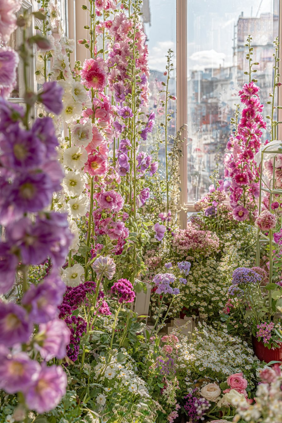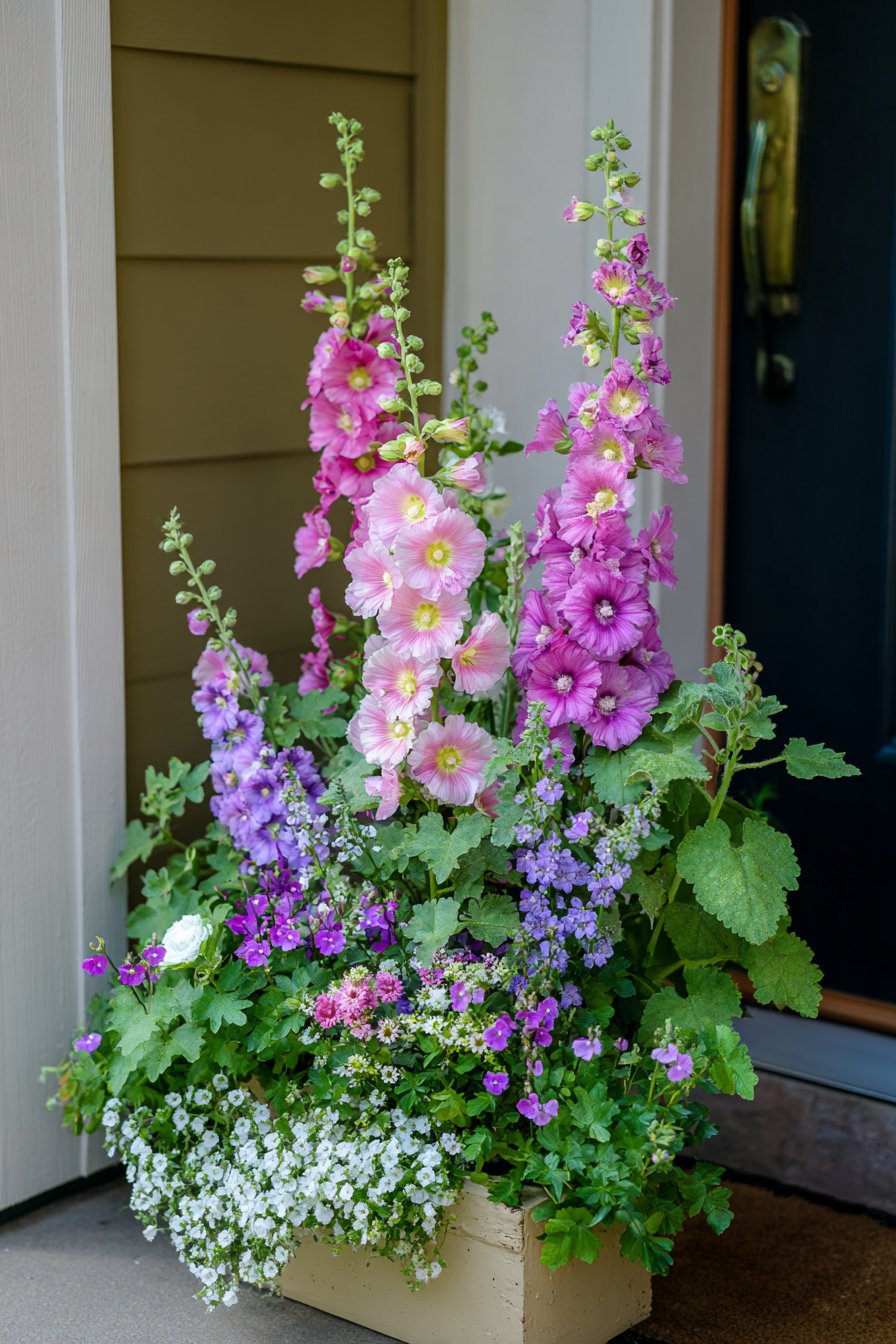 Old-world charm characterizes this romantic balcony flower idea inspired by traditional English cottage gardens. Tall hollyhocks, foxgloves, and delphinium create vertical drama while lower plantings of sweet William and alyssum fill foreground areas with abundant blooms and sweet fragrance. The informal planting style mimics the relaxed abundance of classic cottage gardens, proving these romantic aesthetics translate beautifully to container cultivation.