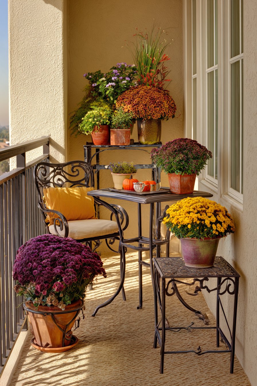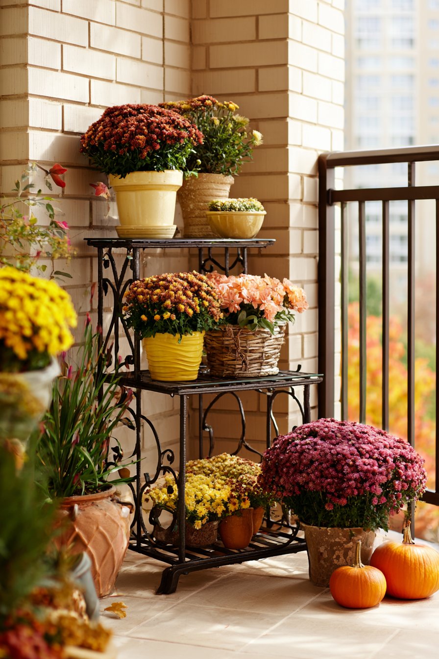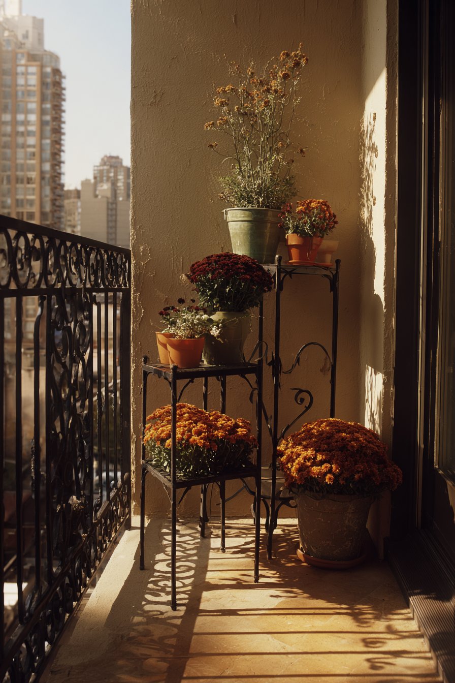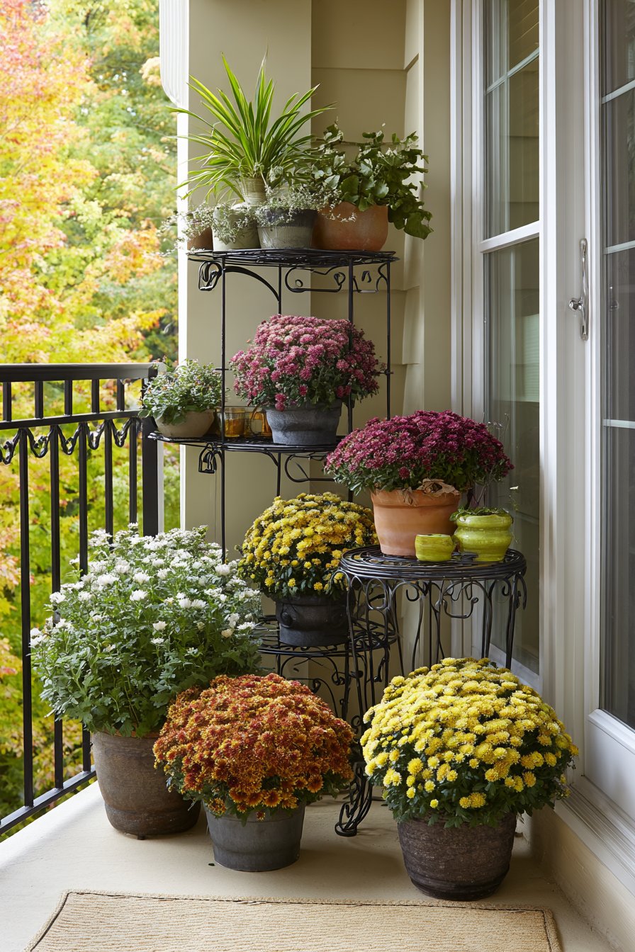 Seasonal celebration takes center stage in this fall-focused balcony flower idea featuring tiered plant stands displaying chrysanthemums in rich autumn colors. Graduating sizes of potted mums in burgundy, gold, and bronze create a seasonal focal point that maximizes vertical space while showcasing the spectacular color range these quintessential fall flowers provide. The structured arrangement demonstrates how intentional composition can transform simple, readily available plants into impressive displays.