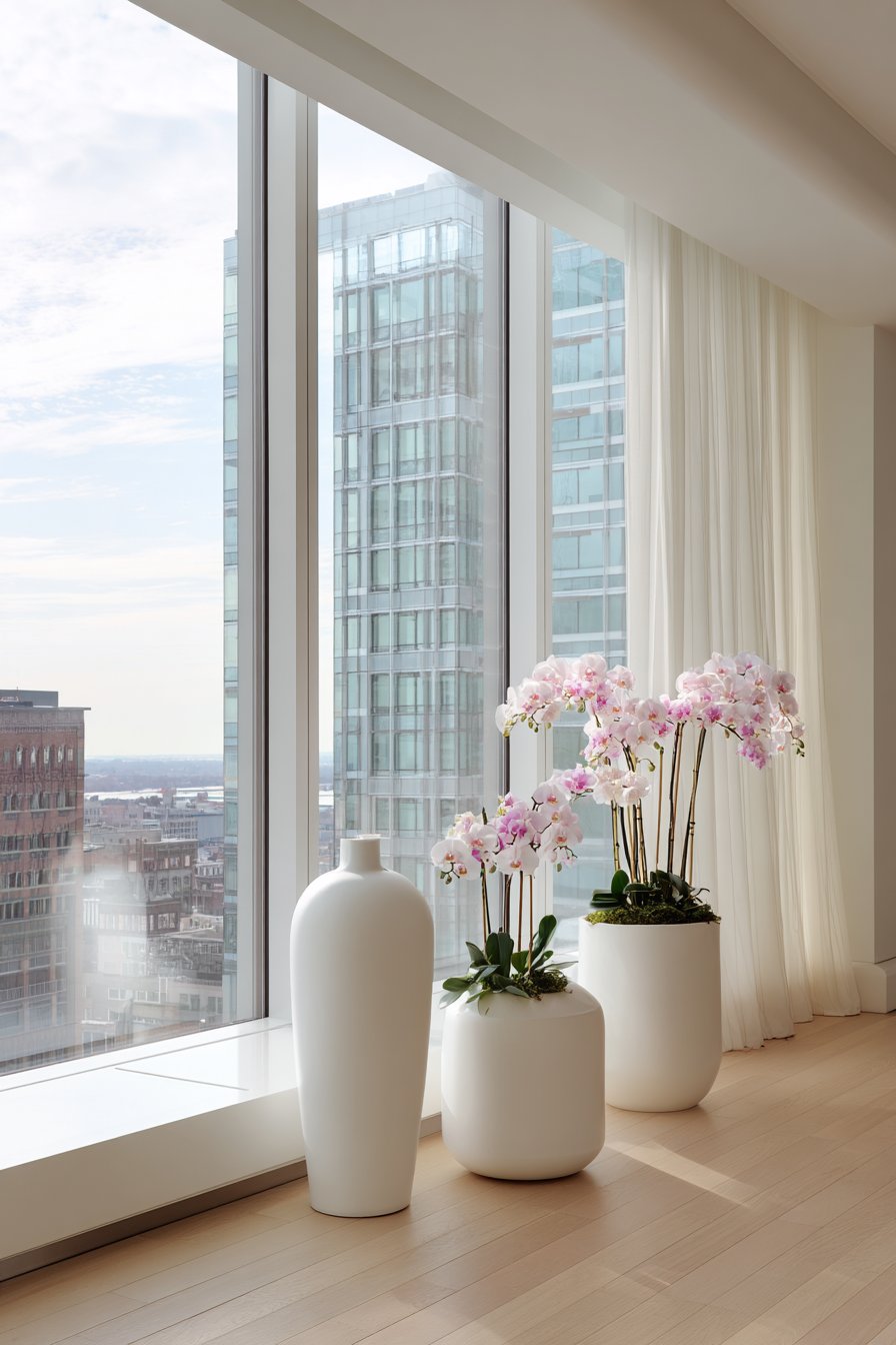 The selection of white or pale pink orchids maintains the minimalist aesthetic while providing enough variation to prevent monotony. Phalaenopsis orchids, the most common type for home growing, offer long-lasting blooms—individual flowers can persist for months—making them practical choices despite their exotic appearance. Their arching sprays of flowers create graceful lines and movement within the otherwise structured composition.