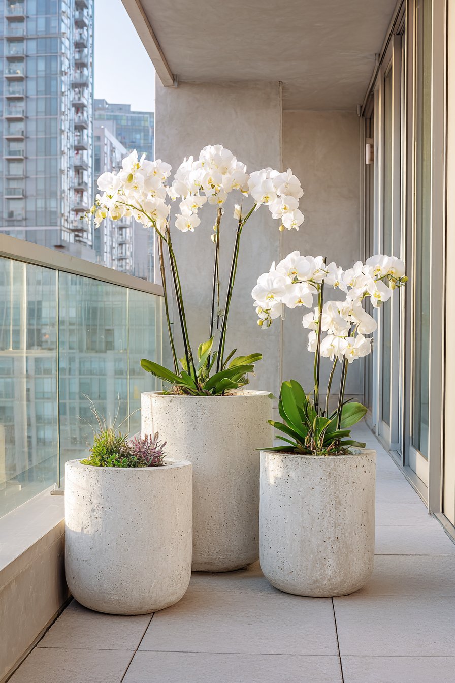 Eastern-influenced design principles create this serene balcony flower idea featuring three identical concrete planters in varying heights, each containing a single spectacular orchid plant. The minimalist approach emphasizes quality over quantity, focusing attention on the architectural beauty and delicate blooms of these elegant flowers. The restrained design allows each orchid to be appreciated fully as the sculptural living art form it represents.