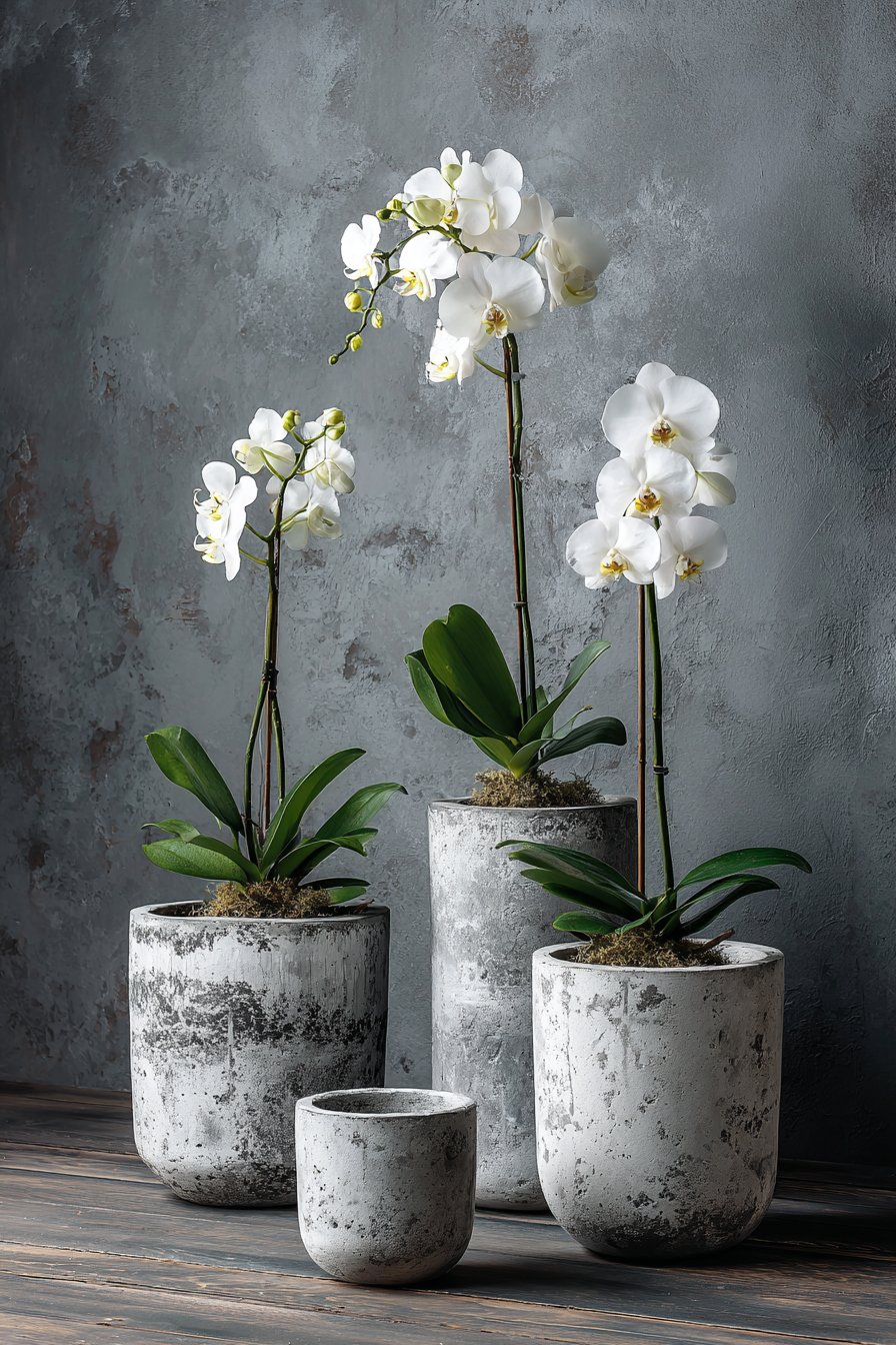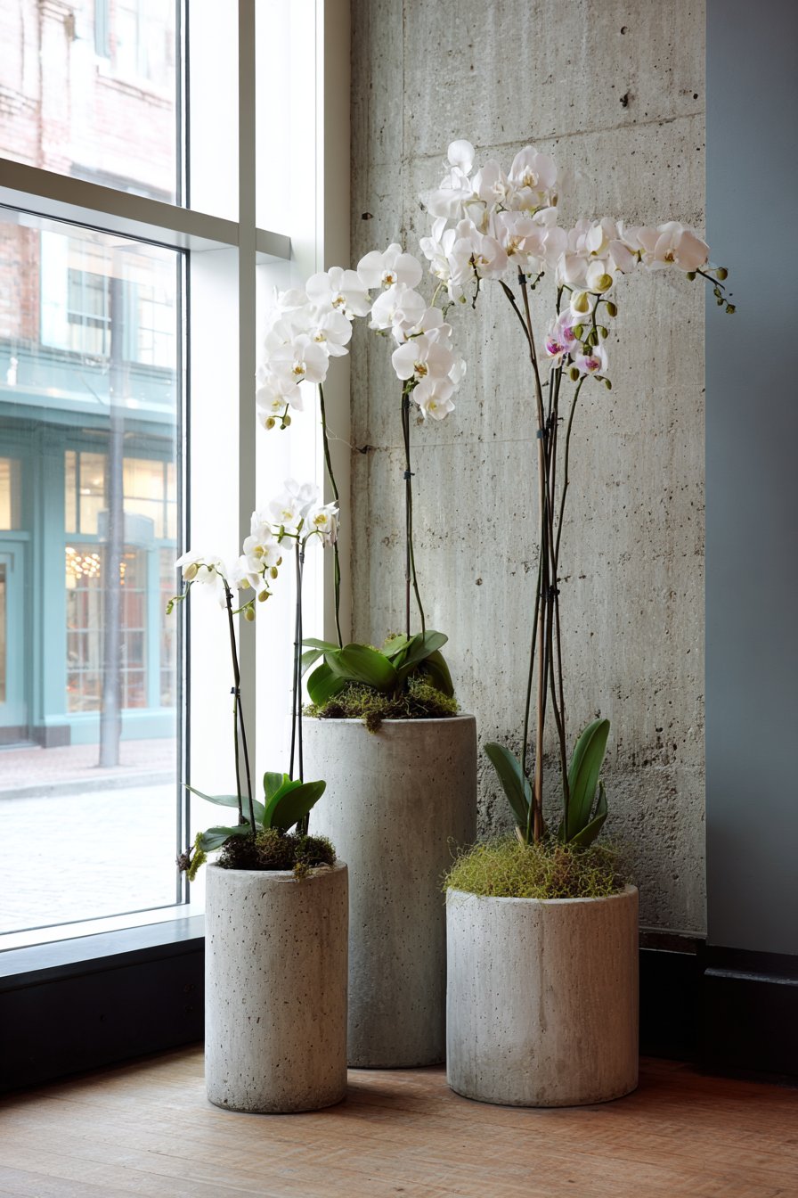 The industrial concrete containers create powerful contrast with the delicate orchids they contain, establishing visual tension that makes both elements more interesting. The rough, matte texture and substantial weight of concrete planters ground the composition physically and visually, while their neutral gray color provides a perfect foil for the pristine white or pale pink orchid blooms. This juxtaposition of rough and refined, heavy and delicate, industrial and organic creates sophisticated visual interest.