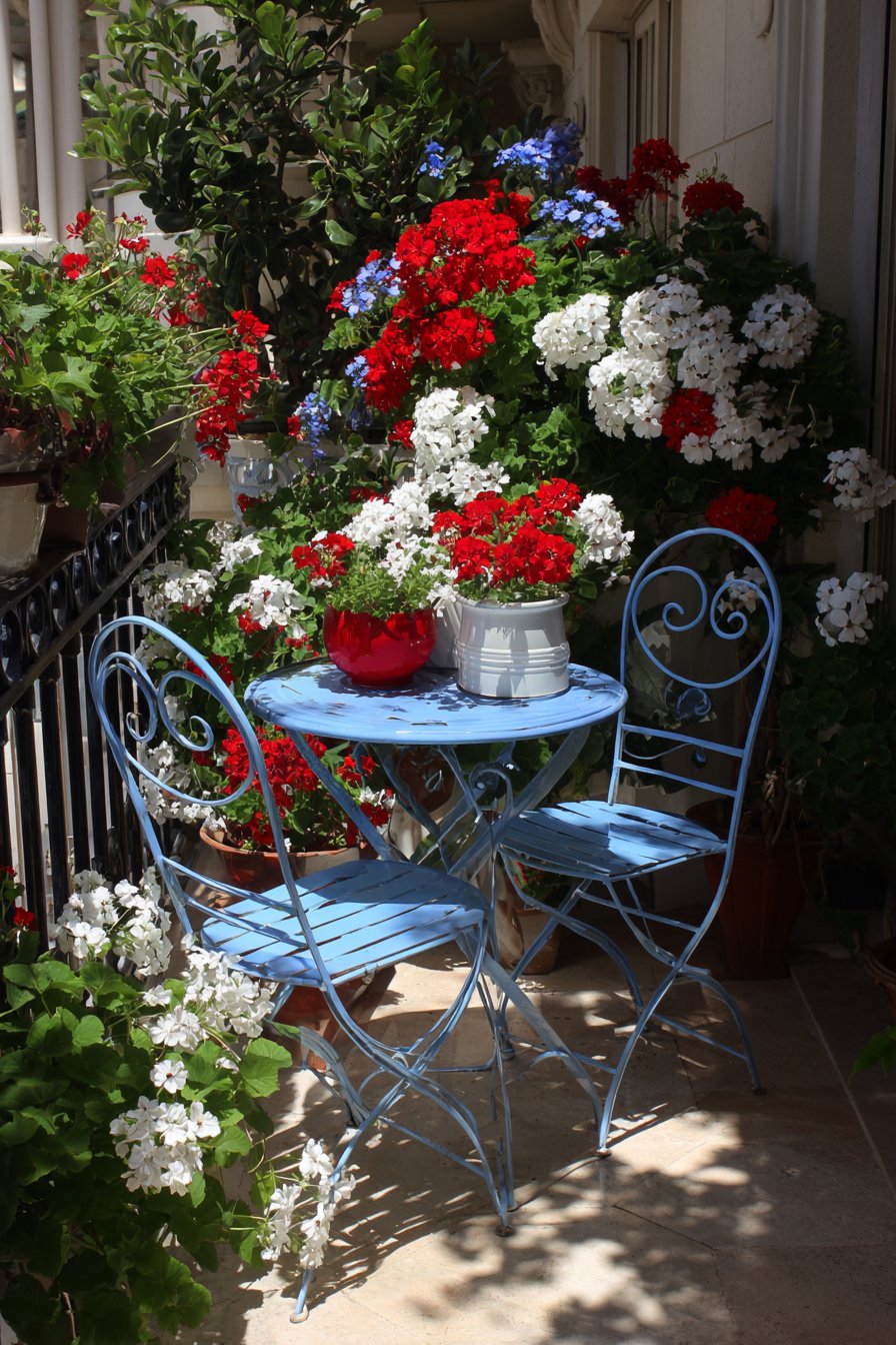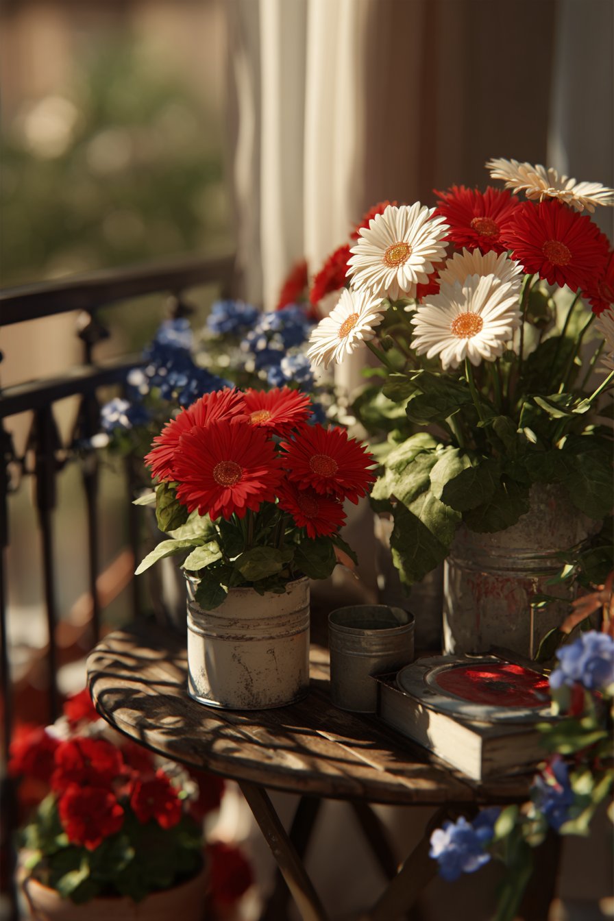 Parisian charm arrives on this balcony through a café-inspired flower arrangement featuring a small round metal table surrounded by potted marguerite daisies and geraniums in classic French country colors. The red, white, and blue color scheme evokes the French flag while creating a patriotic palette that feels fresh and cheerful rather than overtly nationalistic. Vintage-style metal containers complement the European café aesthetic, creating a cohesive design that transforms the balcony into an intimate outdoor dining space.