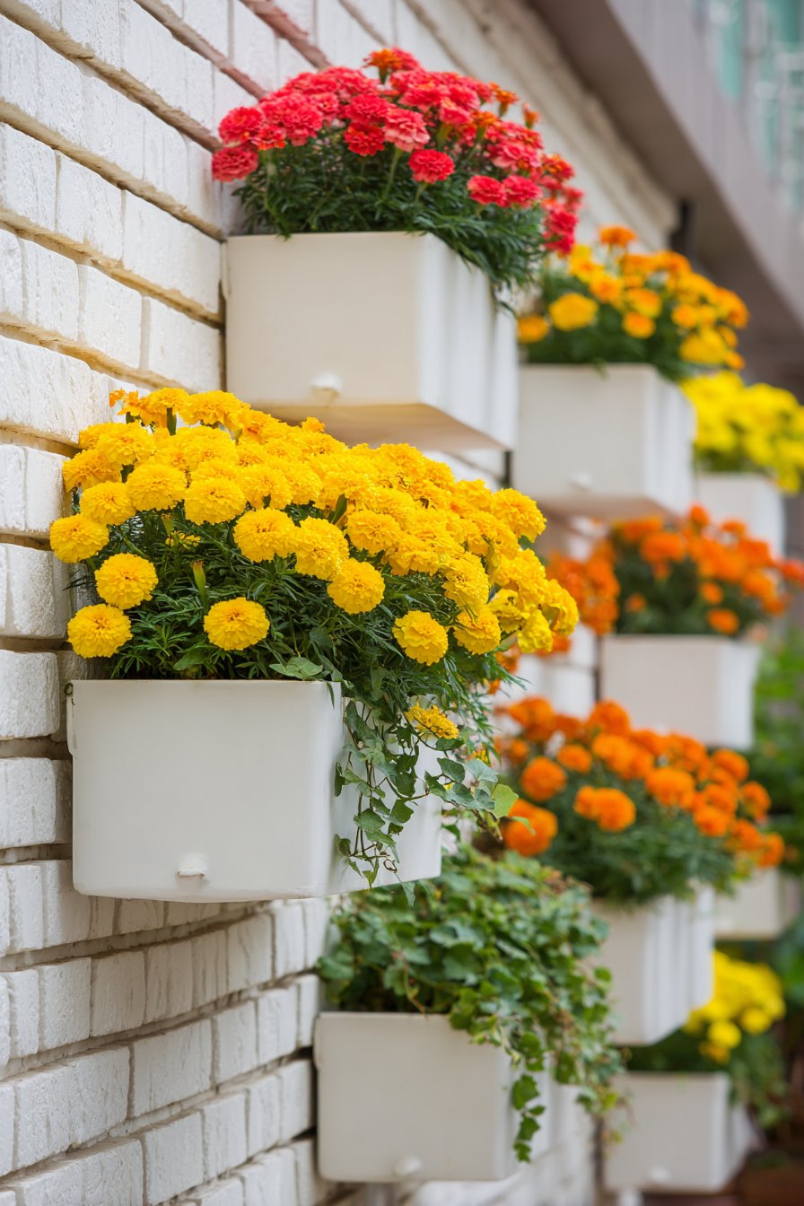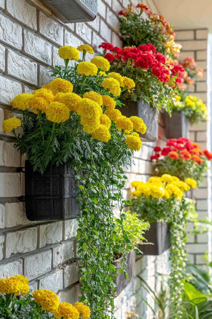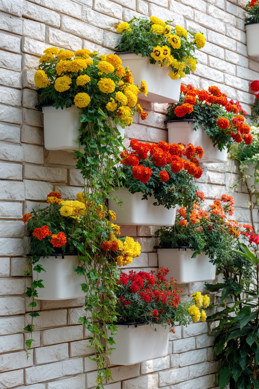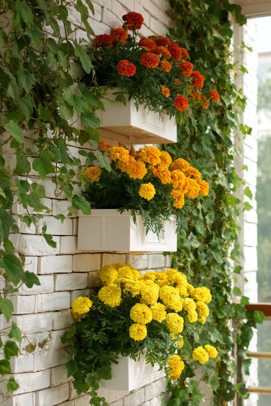 When floor space is at a premium, vertical wall planters offer an ingenious solution for creating abundant floral displays without sacrificing valuable balcony real estate. This space-efficient balcony flower idea showcases a series of wall-mounted planters arranged in tiers against a white brick wall, transforming a previously unused vertical surface into a thriving garden tapestry. Cheerful yellow and orange marigolds share space with vibrant red geraniums and trailing green ivy, creating a color-saturated living wall that commands attention and brings joy.