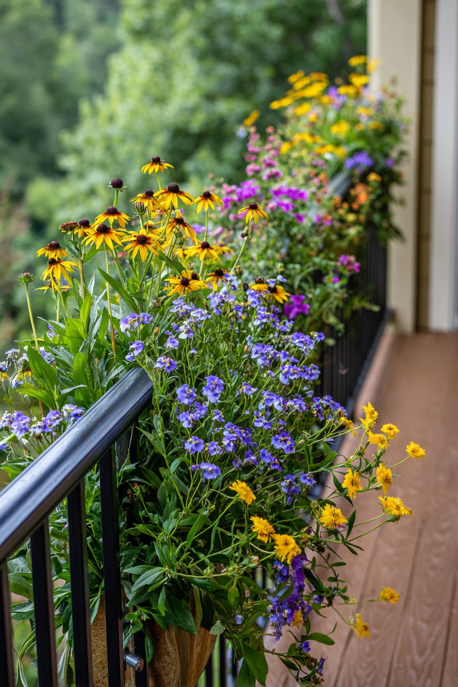 Environmental stewardship and natural beauty combine in this ecological balcony flower idea showcasing native wildflowers in natural cedar planters. Black-eyed Susans, purple coneflowers, and coreopsis create a prairie-style planting that supports local pollinators while providing low-maintenance color. The choice of native species ensures plants are well-adapted to local conditions, resistant to regional pests and diseases, and supportive of indigenous wildlife that has co-evolved with these plants.