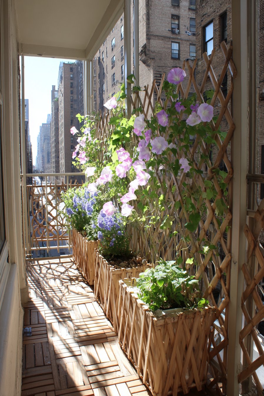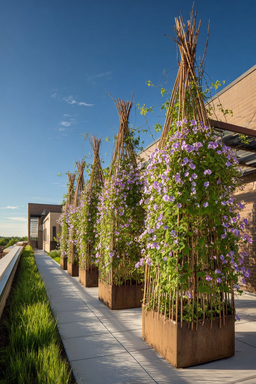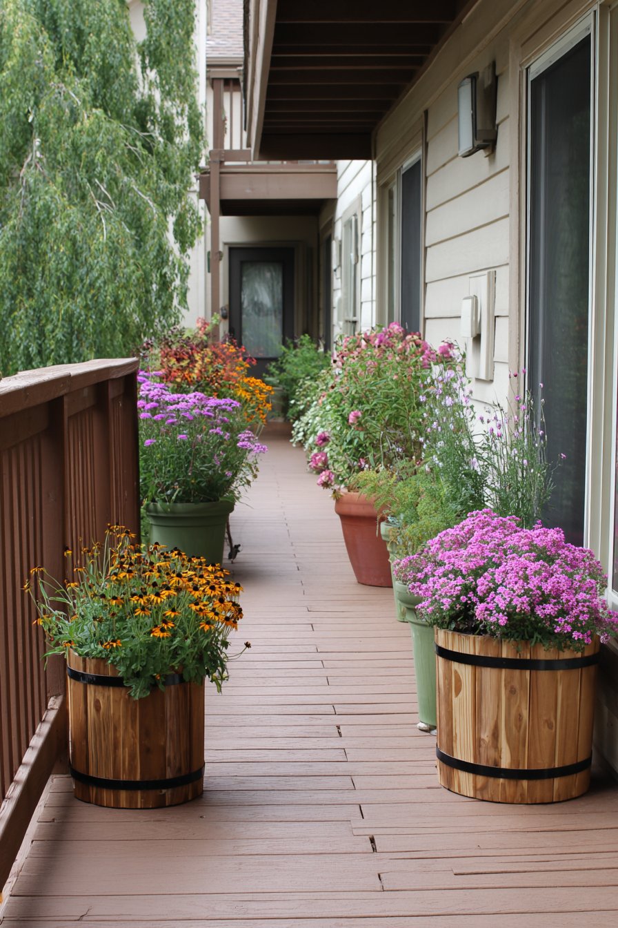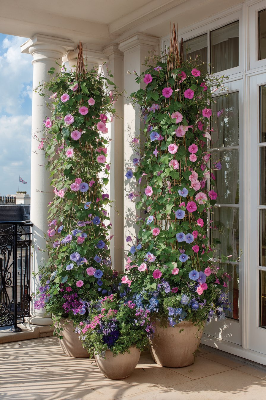 Functional beauty defines this balcony flower idea featuring tall planters with climbing morning glories and sweet peas trained on bamboo teepee supports. The vertical garden creates a living wall of flowers that provides seclusion while maximizing limited floor space—an ideal solution for balconies overlooking neighboring properties or public areas. Pink, purple, and blue blooms create a romantic color story while the lush growth offers genuine privacy without the harshness of solid barriers.