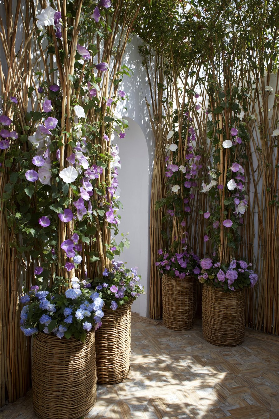 Soft morning light illuminates the delicate vine flowers and creates interesting shadows through the living screen, demonstrating how the arrangement functions aesthetically while serving its practical purpose. The interplay of light and shadow through the foliage creates dynamic visual interest throughout the day.