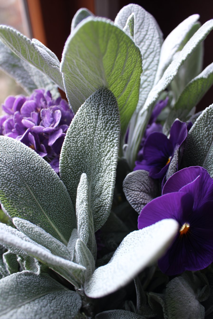 Gentle afternoon light highlights the tactile qualities of foliage and petals, emphasizing the fuzzy texture of lamb’s ear and the subtle sheen of pansy petals. The lighting creates subtle shadows that accentuate three-dimensional texture, inviting close observation and interaction.