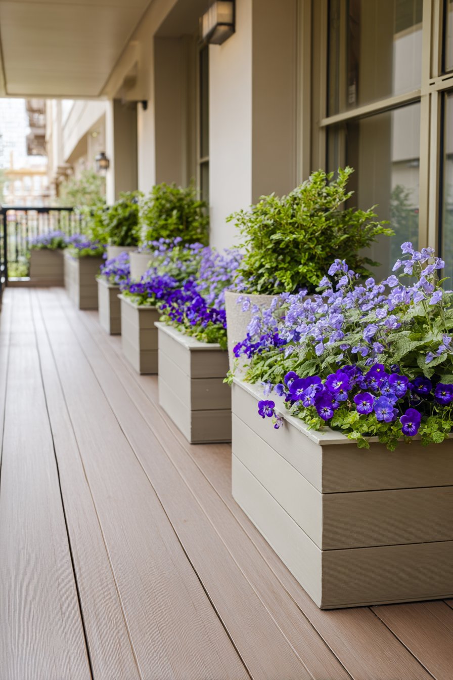 Universal design principles inspire this accessible balcony flower idea featuring raised planters positioned at comfortable height for easy interaction. Touchable lamb’s ear with its soft, fuzzy foliage, fragrant heliotrope with vanilla-scented purple blooms, and velvety pansies create a sensory garden encouraging engagement through multiple senses. The accessible design proves particularly valuable for elderly gardeners, children, or anyone with mobility limitations that make traditional ground-level gardening challenging.