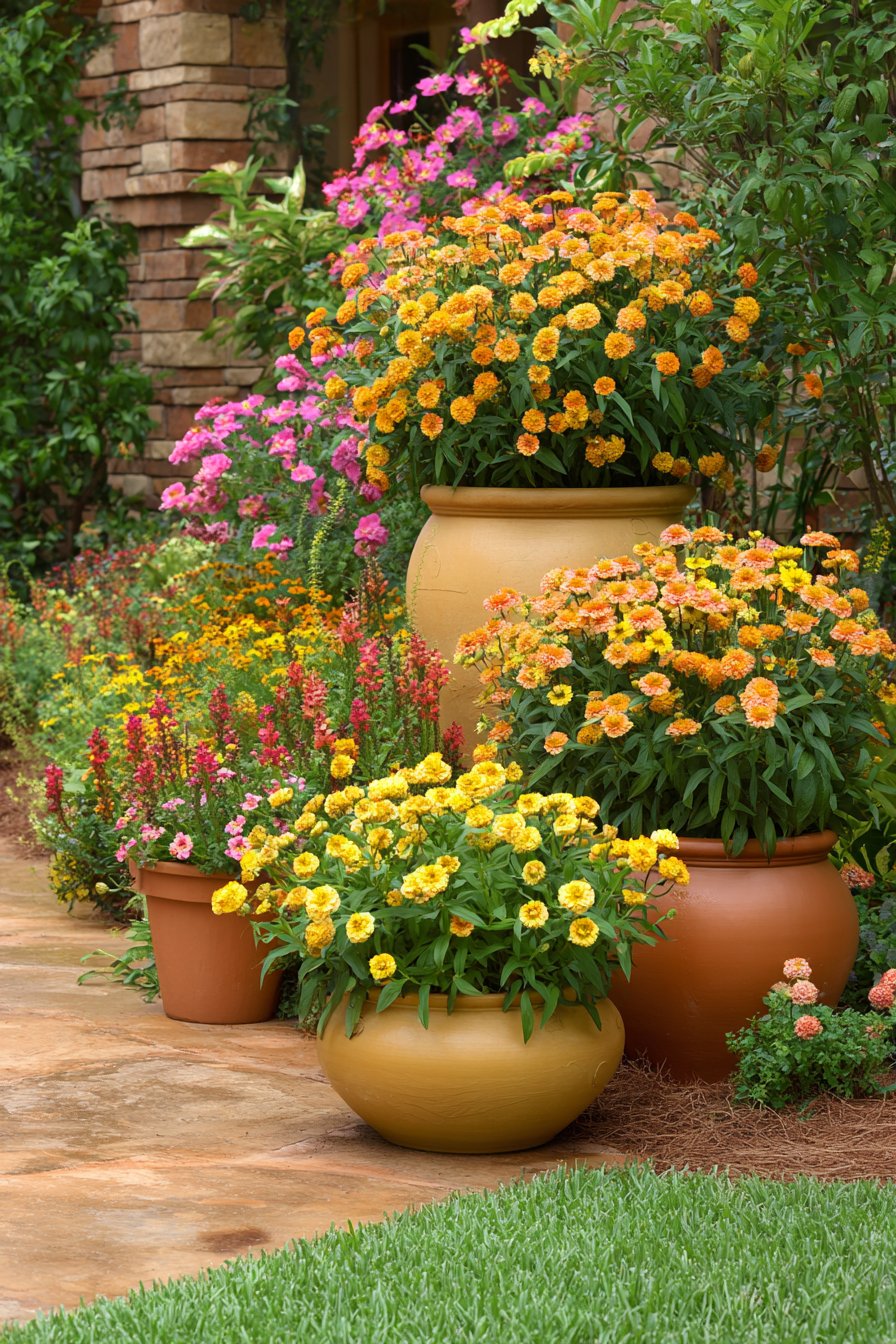 Container selection reinforces the warm color theme through burnt orange ceramic planters that echo the flower colors while providing grounding neutral presence. This coordination between containers and contents creates unity and demonstrates attention to detail that elevates casual gardening to genuine design.