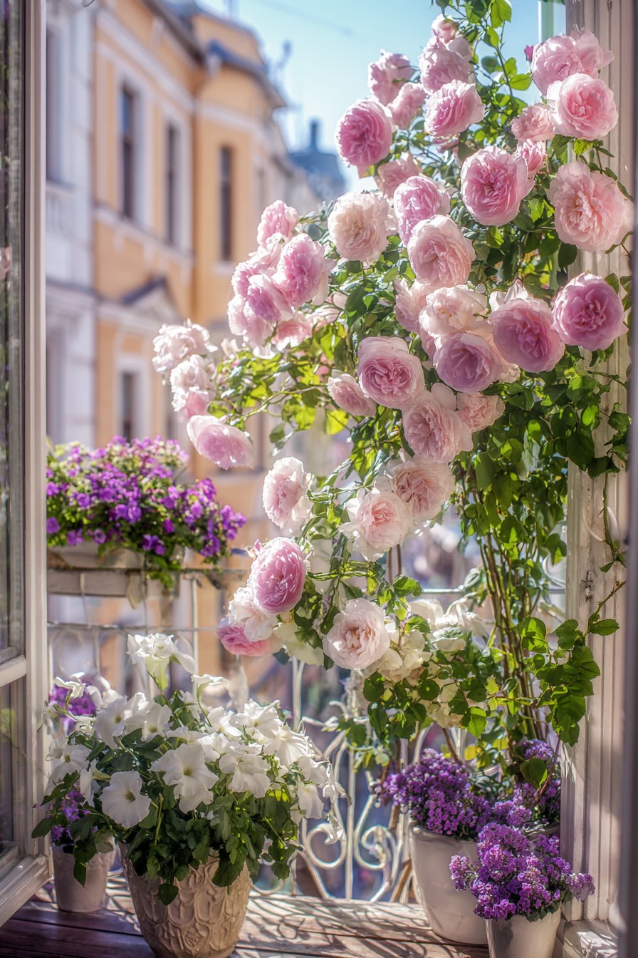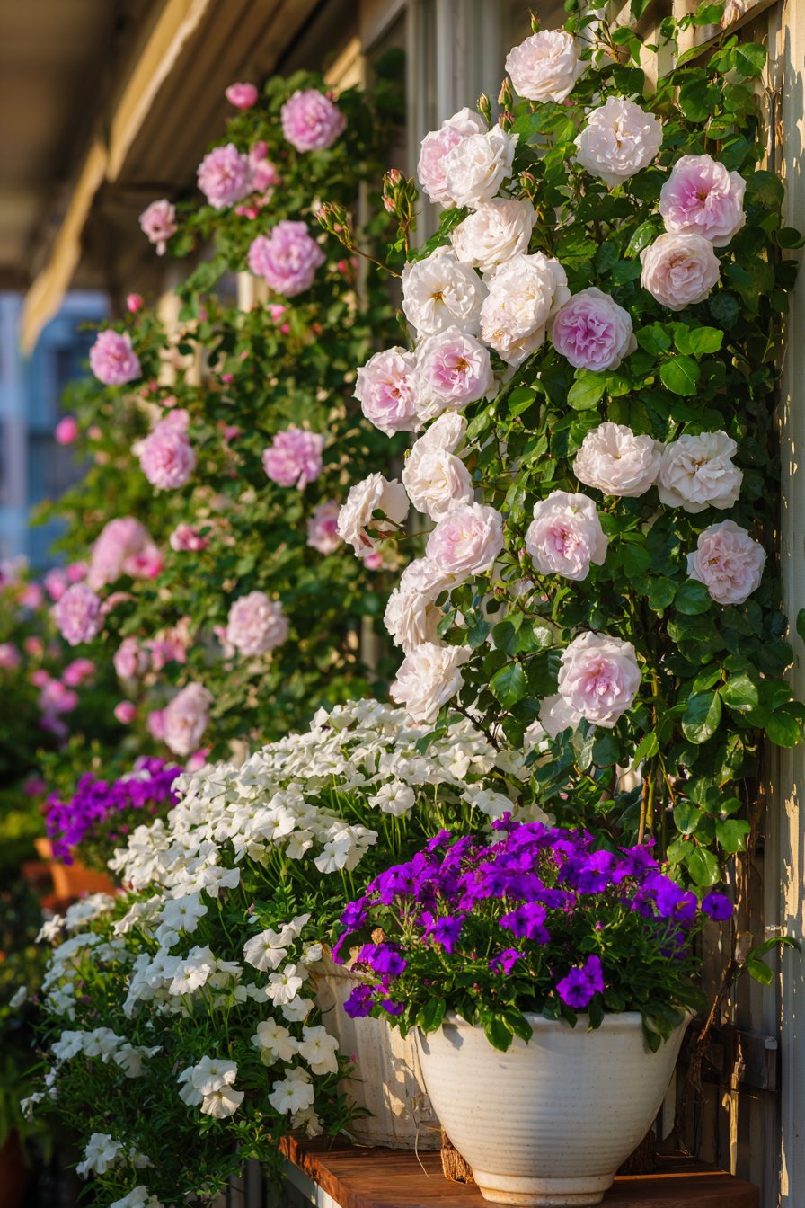Few balcony flower ideas capture timeless romance quite like climbing roses trained along a trellis system. This elegant approach features soft pink roses carefully guided up a vertical support structure attached to the balcony wall, creating a living screen of fragrant blooms that offers both beauty and privacy. Below the climbing roses, complementary plantings of white impatiens and purple verbena fill decorative ceramic pots, establishing a layered composition that maximizes visual interest while maintaining an efficient footprint.