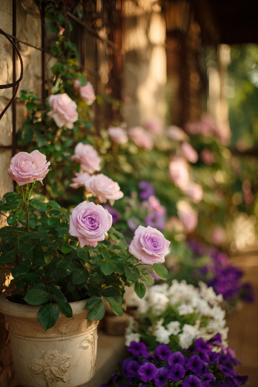 Golden hour lighting transforms this arrangement into something truly magical. As warm evening light filters through the rose petals, it illuminates their delicate translucence while casting gentle shadows that emphasize the flowers’ dimensional form. The underplantings catch this same warm light, creating a cohesive glow that makes the entire corner feel enchanted and inviting.