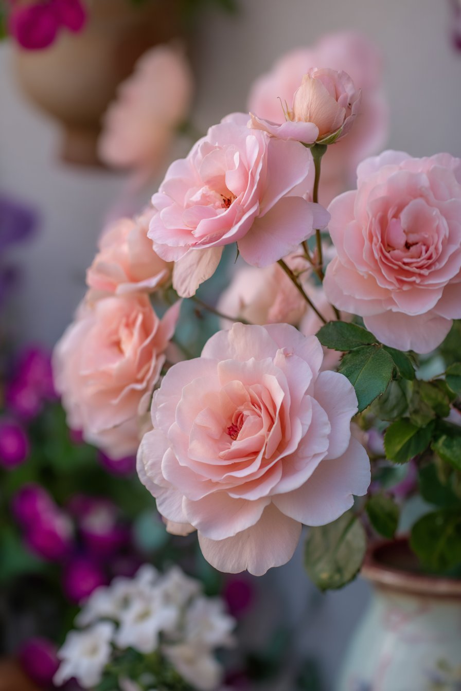 Color coordination plays a crucial role in this arrangement’s success. The soft pink roses establish the primary color theme, while white impatiens provide bright contrast and purple verbena introduces a complementary accent that enhances the pink tones without competing for attention. This triadic color scheme creates harmony and sophistication, demonstrating how thoughtful plant selection can elevate a balcony from merely decorated to genuinely designed.
