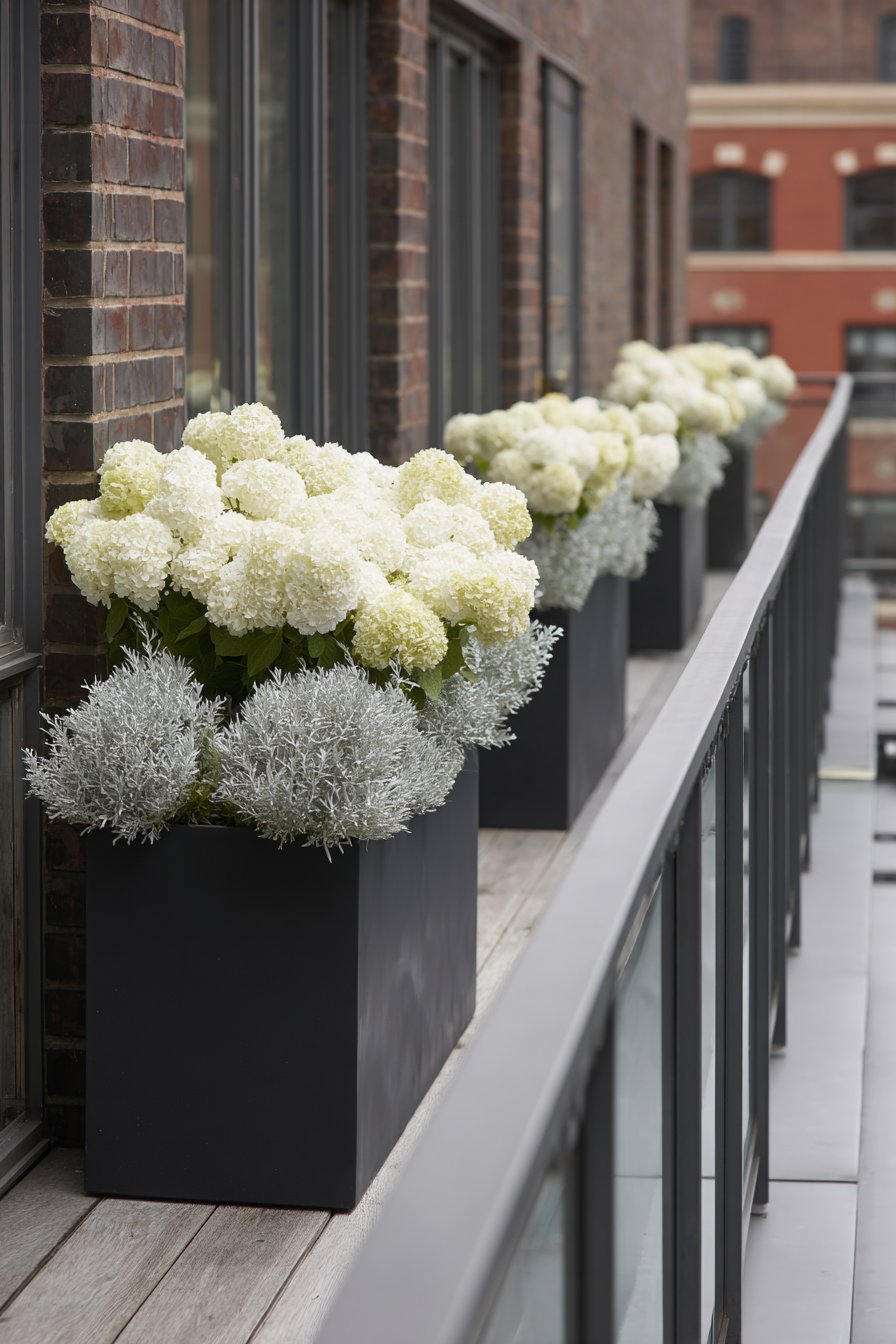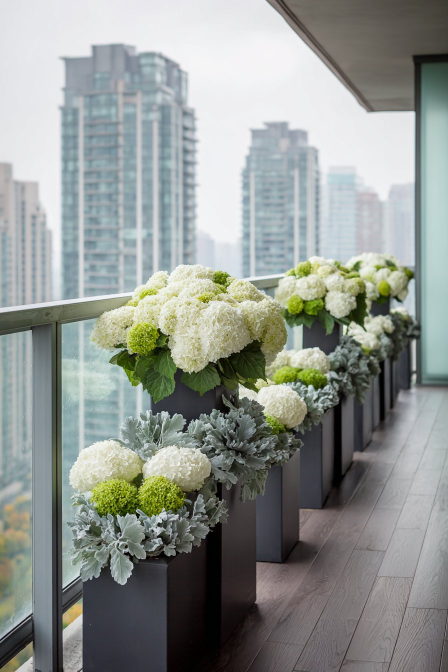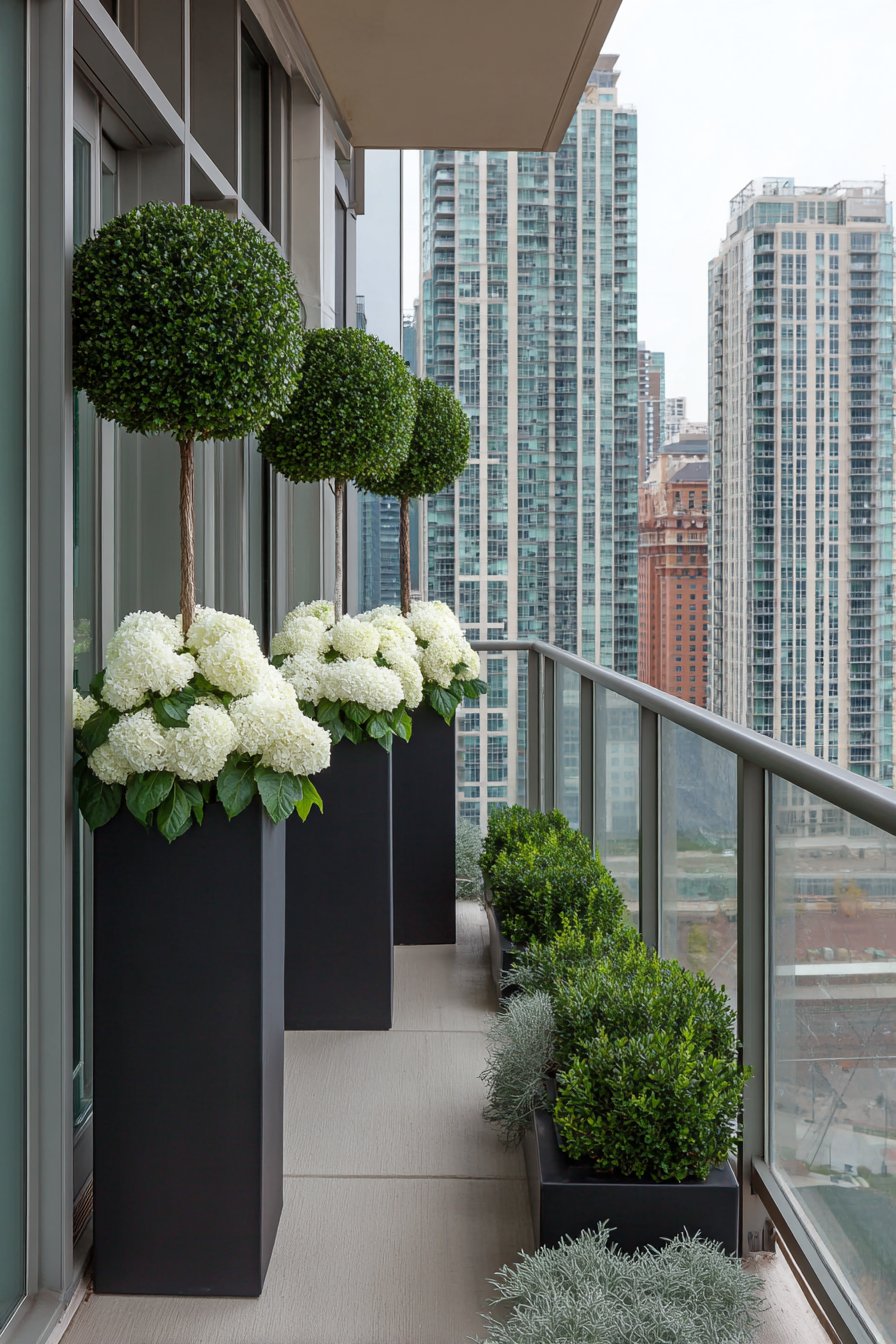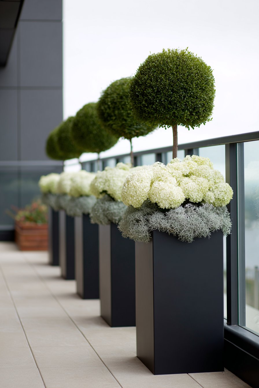 Contemporary design sensibilities shine in this sleek modern balcony flower idea featuring structured plantings in architectural containers. Matte black rectangular planters align precisely along the glass balcony railing, their clean lines creating geometric rhythm while displaying carefully selected plants. Structured boxwood topiaries provide evergreen architectural form, while white hydrangeas offer seasonal blooming interest. Underplantings of silvery dusty miller introduce textural contrast and subtle color variation within the restrained palette.