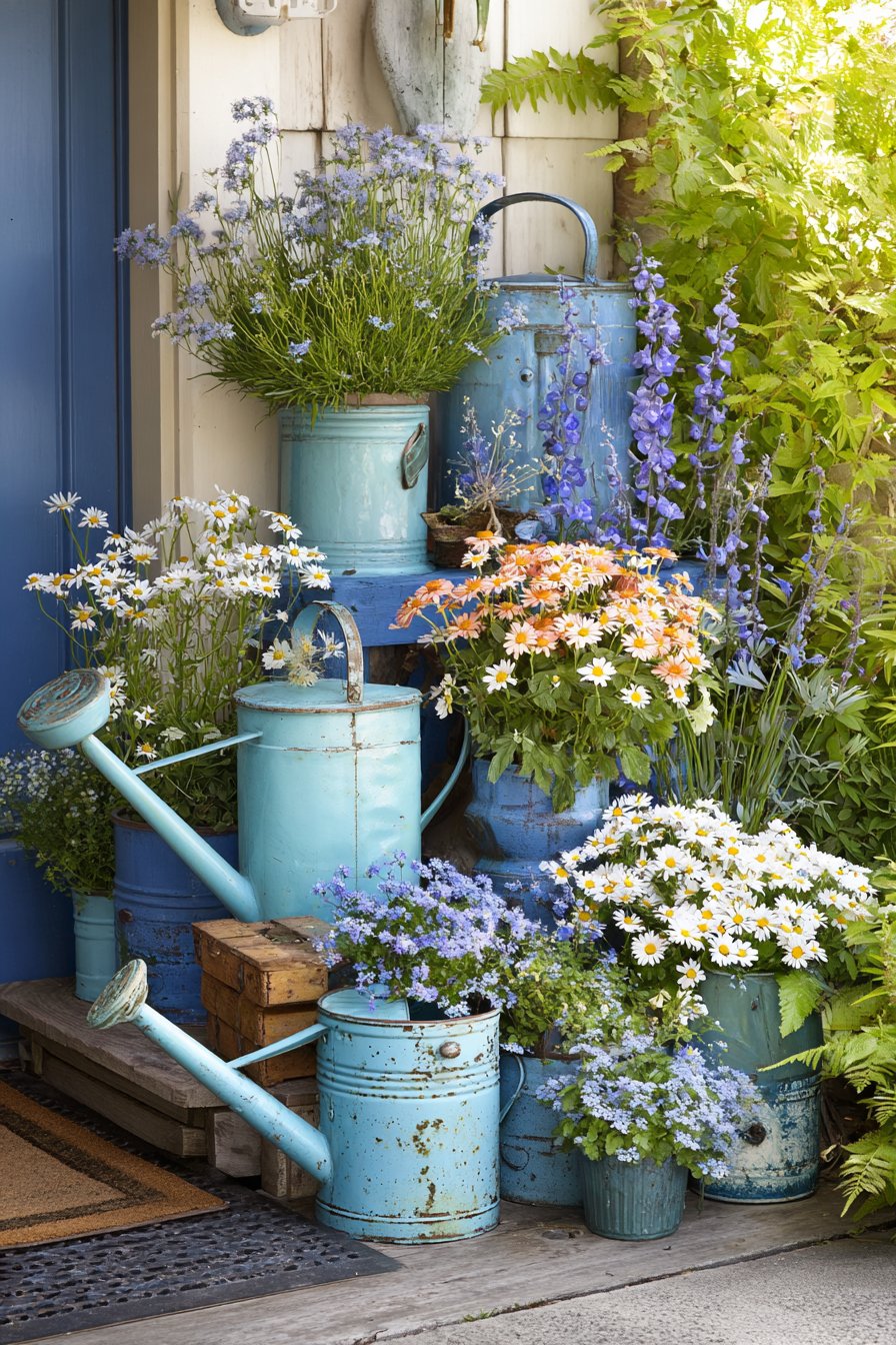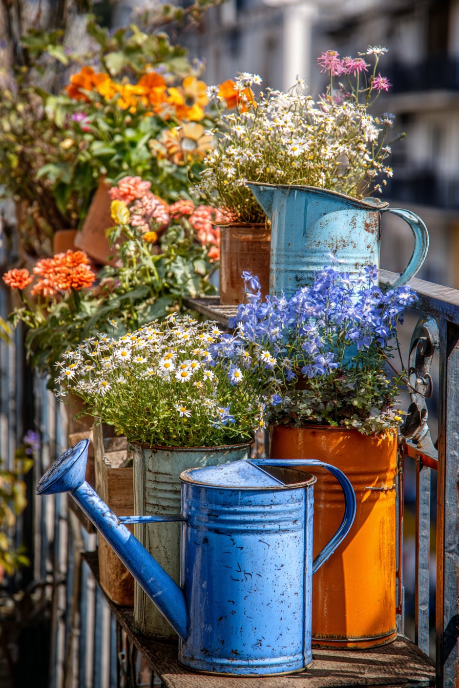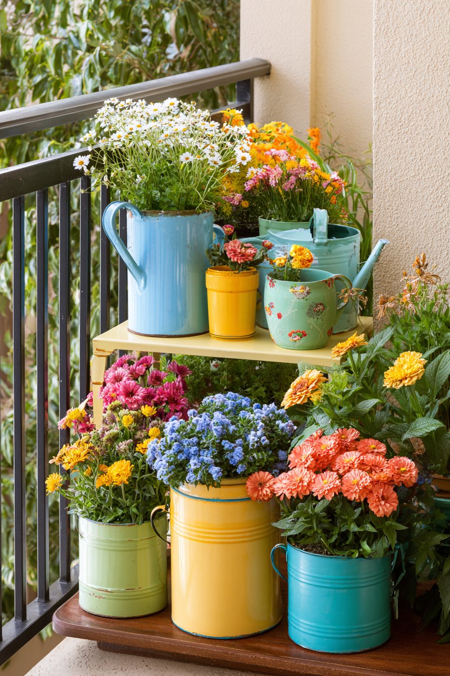 Nostalgia and charm define this eclectic balcony flower idea featuring repurposed vintage containers transformed into delightful planters. Antique watering cans, enamelware basins, and weathered metal buckets overflow with cheerful daisies, blue lobelia, and coral-colored zinnias, creating a whimsical cottage garden vignette that celebrates personality and resourcefulness. The varied container heights, finishes, and styles add visual complexity and character impossible to achieve with matching store-bought planters.