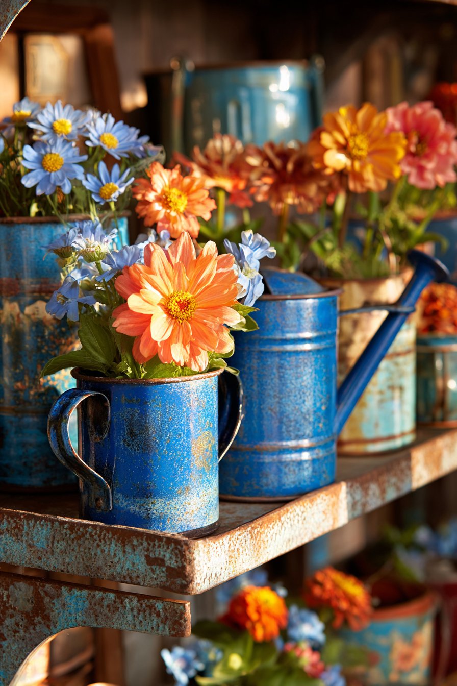 Natural sunlight creates highlights on the varied metal surfaces of the vintage containers, emphasizing their textures and worn finishes while illuminating the diverse blooms in their true colors. This interplay between container character and floral beauty creates visual richness and depth that rewards close observation and encourages lingering in the space.