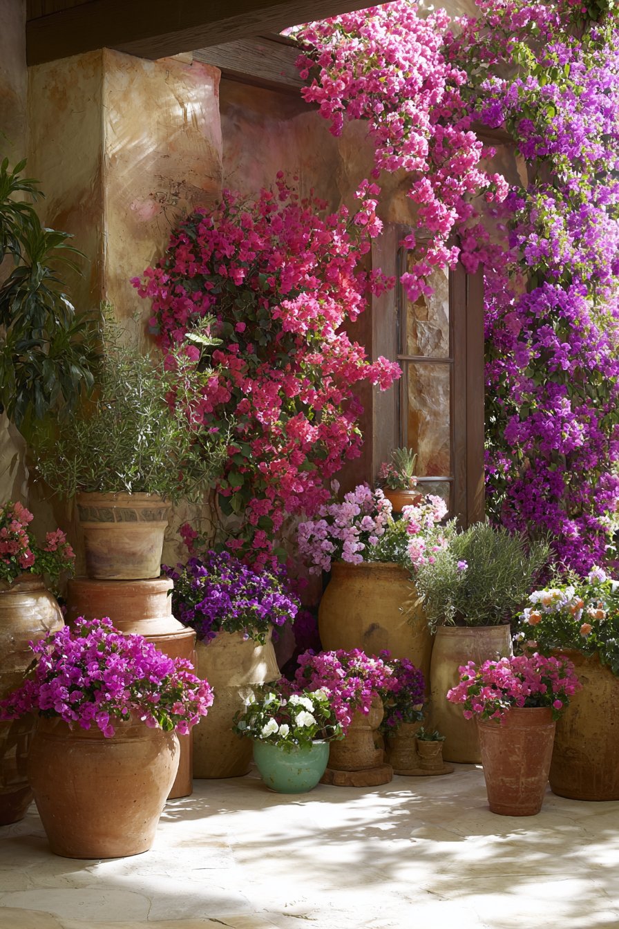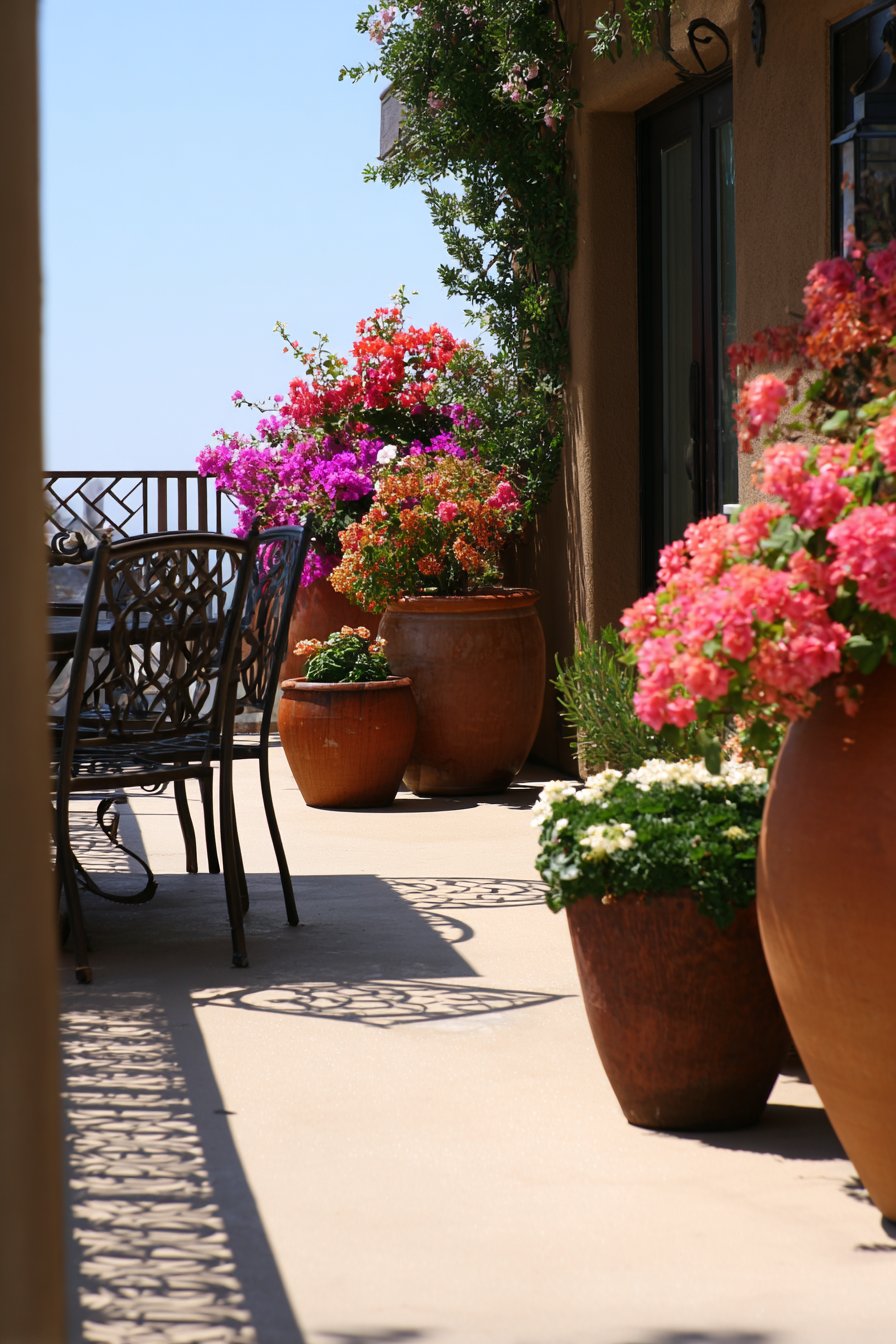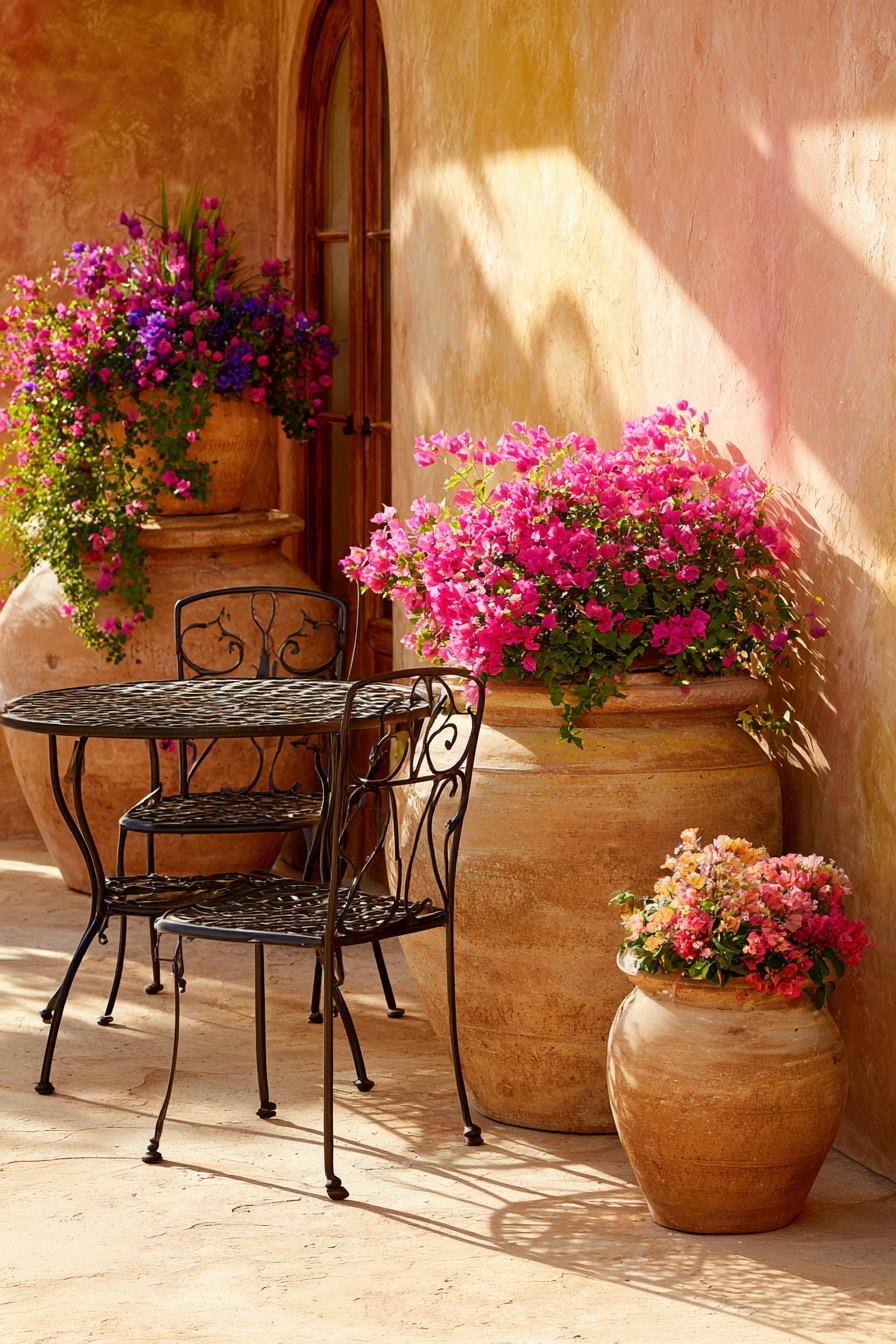Terracotta’s warm earth tones complement wrought iron furniture and architectural elements beautifully, creating cohesive design that feels intentional and complete. The slightly rough, porous texture of clay pots contrasts pleasingly with the smooth, glossy leaves of bougainvillea and the soft, needle-like foliage of rosemary. This textural variety keeps the arrangement interesting even when flowering is less abundant, demonstrating the importance of considering year-round appeal when planning balcony gardens.