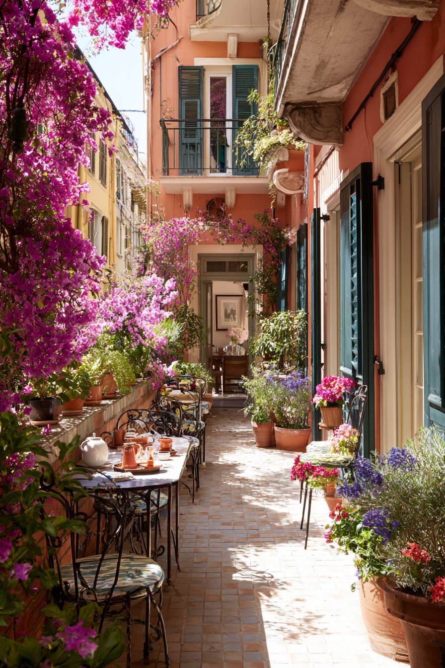 - Use bistro-style metal furniture in classic colors like black, white, or verdigris green
