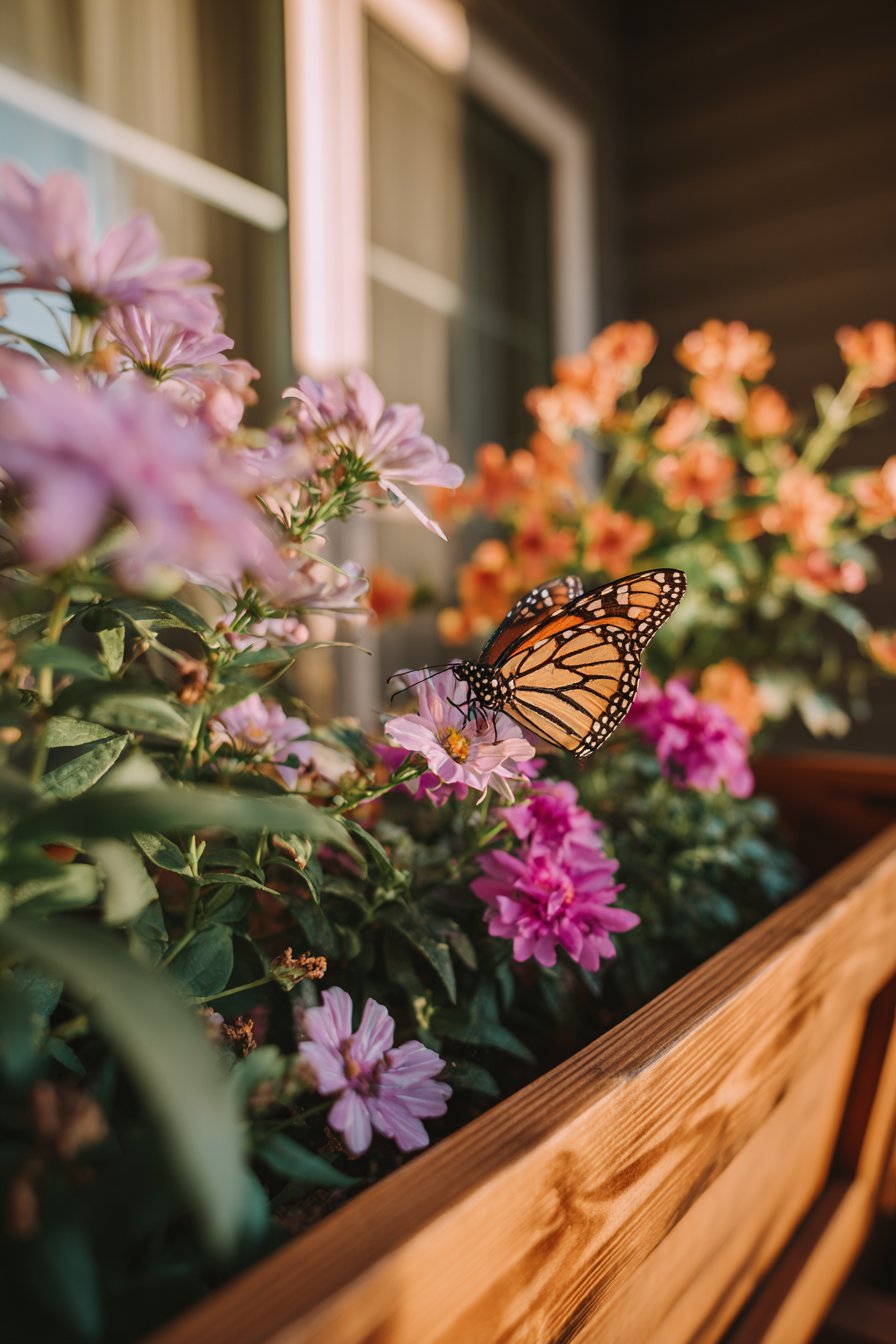 Natural afternoon lighting highlights the remarkable sight of butterflies and other pollinators actively visiting the flowers, their movement adding living animation to the garden. Observing these interactions creates connection to natural cycles and wildlife that urban living often obscures, providing educational and emotional benefits alongside the aesthetic rewards.