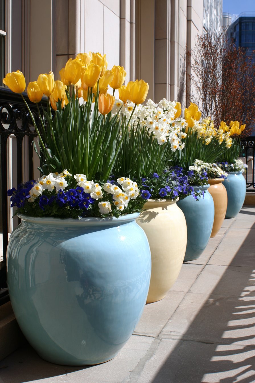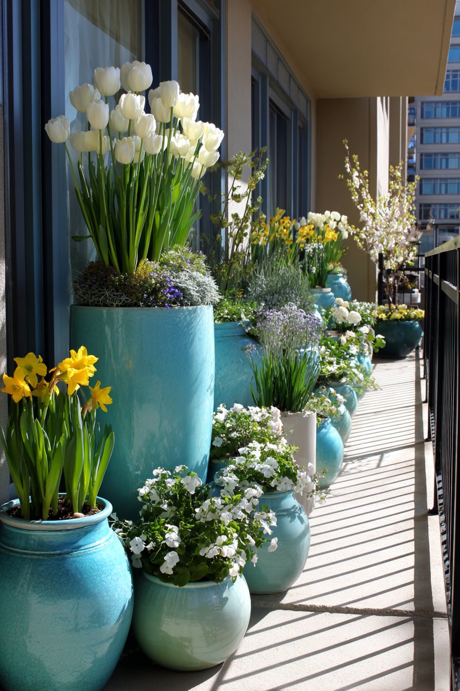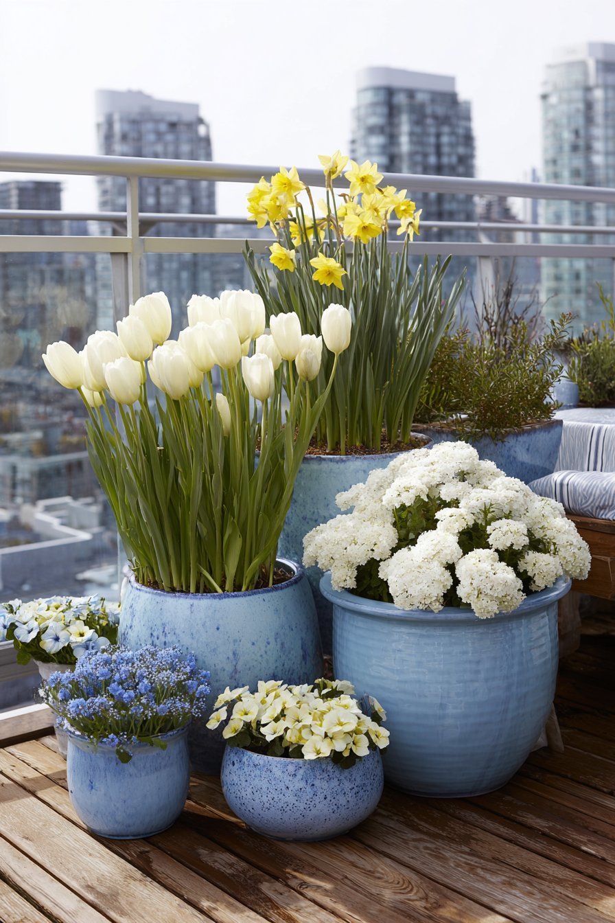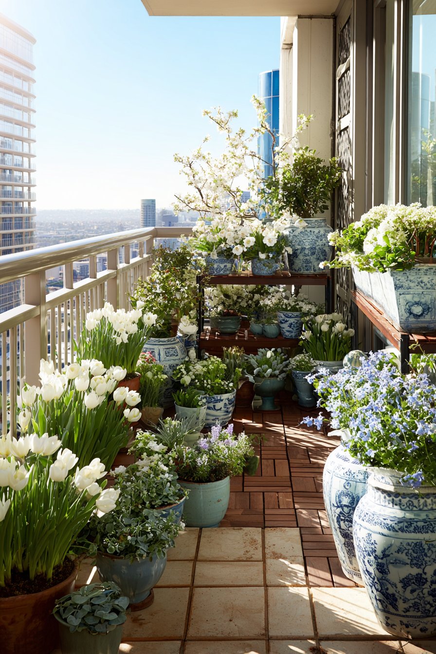 Strategic planning enables year-round balcony beauty through this succession planting approach. The display showcases seasonal rotation with spring tulips and daffodils in glazed ceramic pots designed to transition seamlessly to summer petunias as seasons change. This demonstrates that balcony gardens need not remain static, but can evolve throughout the year to provide continuous color and interest while celebrating the natural progression of seasons.
