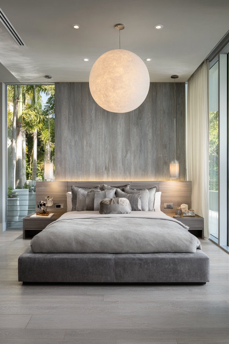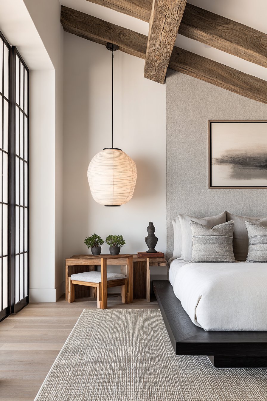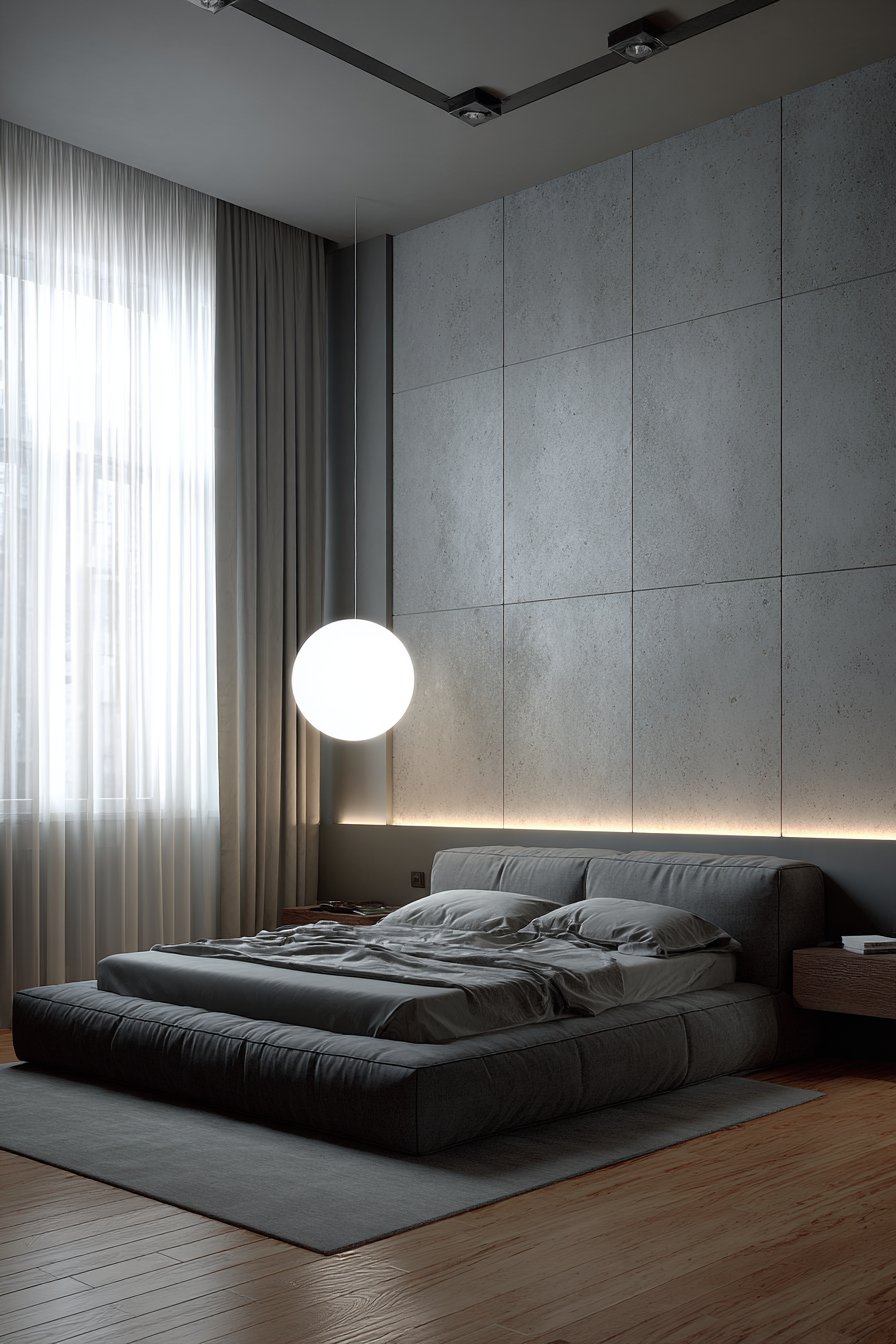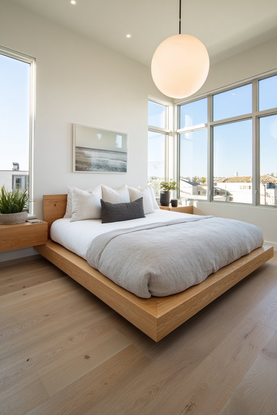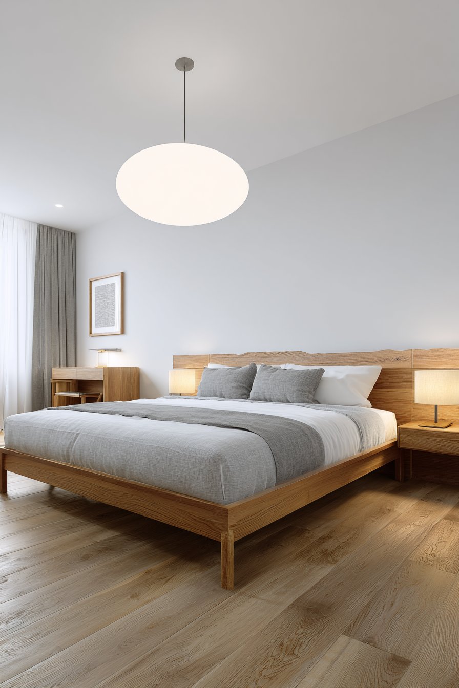 Textured white oak flooring provides warmth and natural variation beneath the minimalist furnishings, while sheer curtains diffuse incoming daylight into a soft, ethereal glow that enhances the room’s serene quality. The strategic placement of a minimalist pendant light centered above the bed serves as both functional illumination and sculptural element, its simple form echoing the room’s commitment to essential design. This carefully edited approach to bedroom design proves that luxury doesn’t require abundance—it requires intention.