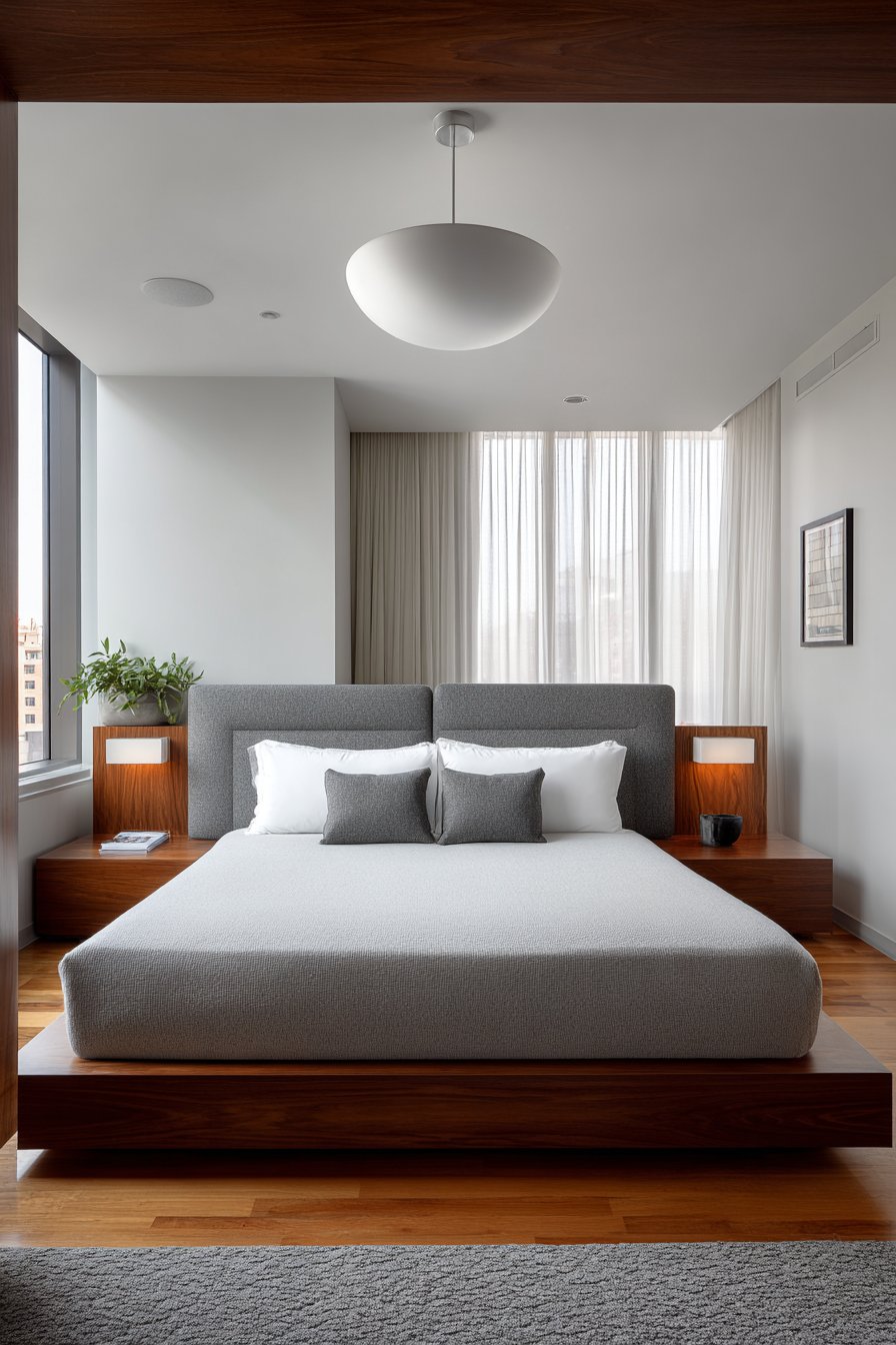 The beauty of this contemporary space lies in its restraint and the breathing room it provides. Each morning begins in clarity, each evening ends in peace, as the absence of visual clutter promotes mental tranquility. The monochromatic palette of greys, whites, and natural wood tones creates sophisticated cohesion, while varied textures—from the smooth upholstery to the grainy oak to the flowing sheers—provide sensory interest without introducing chaos.