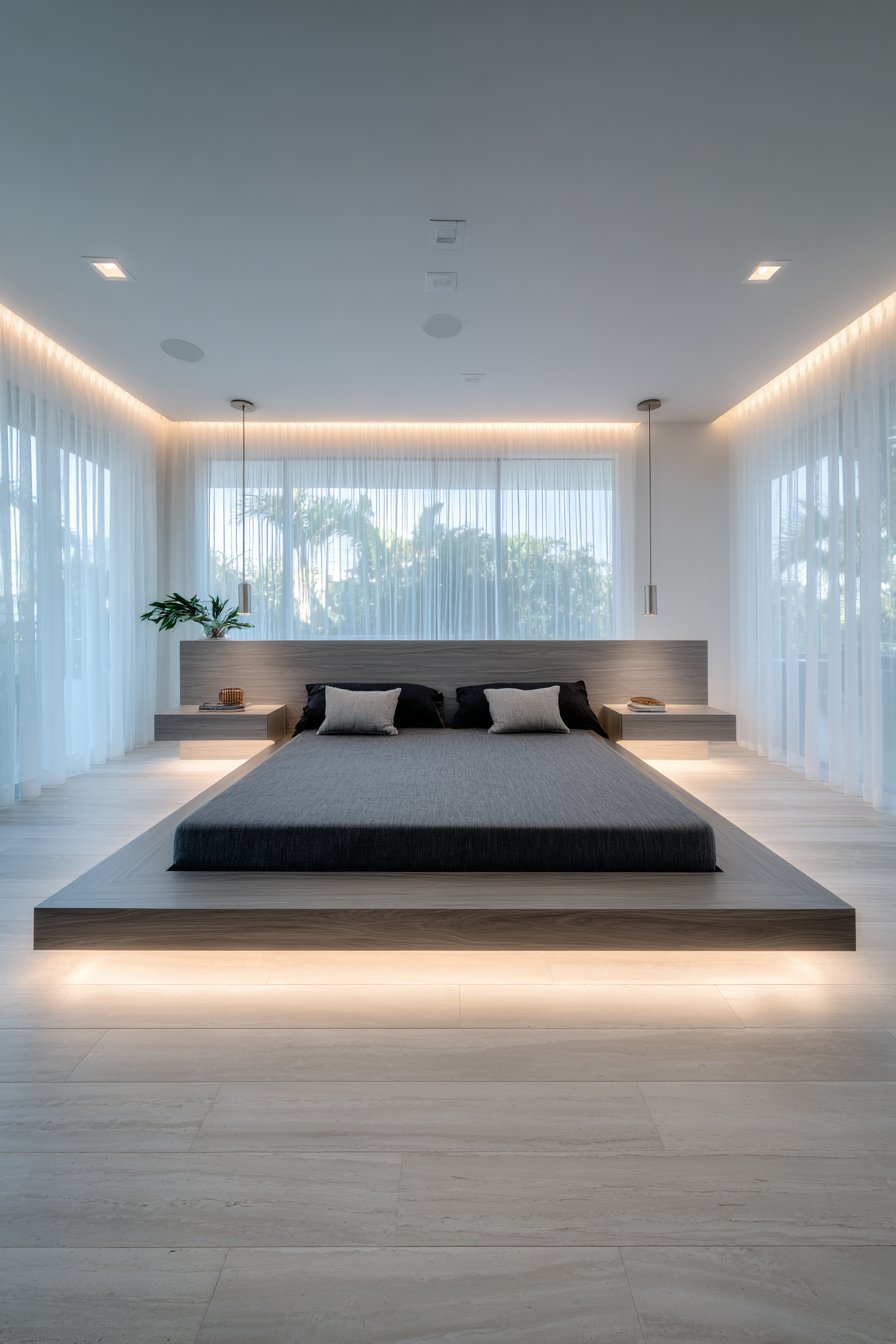 The modern platform bedroom embraces the philosophy that less truly is more, creating a space where every element serves both aesthetic and functional purpose. A low-profile California king platform bed in charcoal grey upholstery becomes the room’s focal point, its clean horizontal lines emphasizing the bed’s impressive length while maintaining visual restraint. The absence of a traditional box spring creates a grounded, contemporary silhouette that anchors the space without overwhelming it. Floating nightstands with integrated LED lighting flank the bed, their wall-mounted design preserving floor space and contributing to the room’s airy, uncluttered atmosphere.