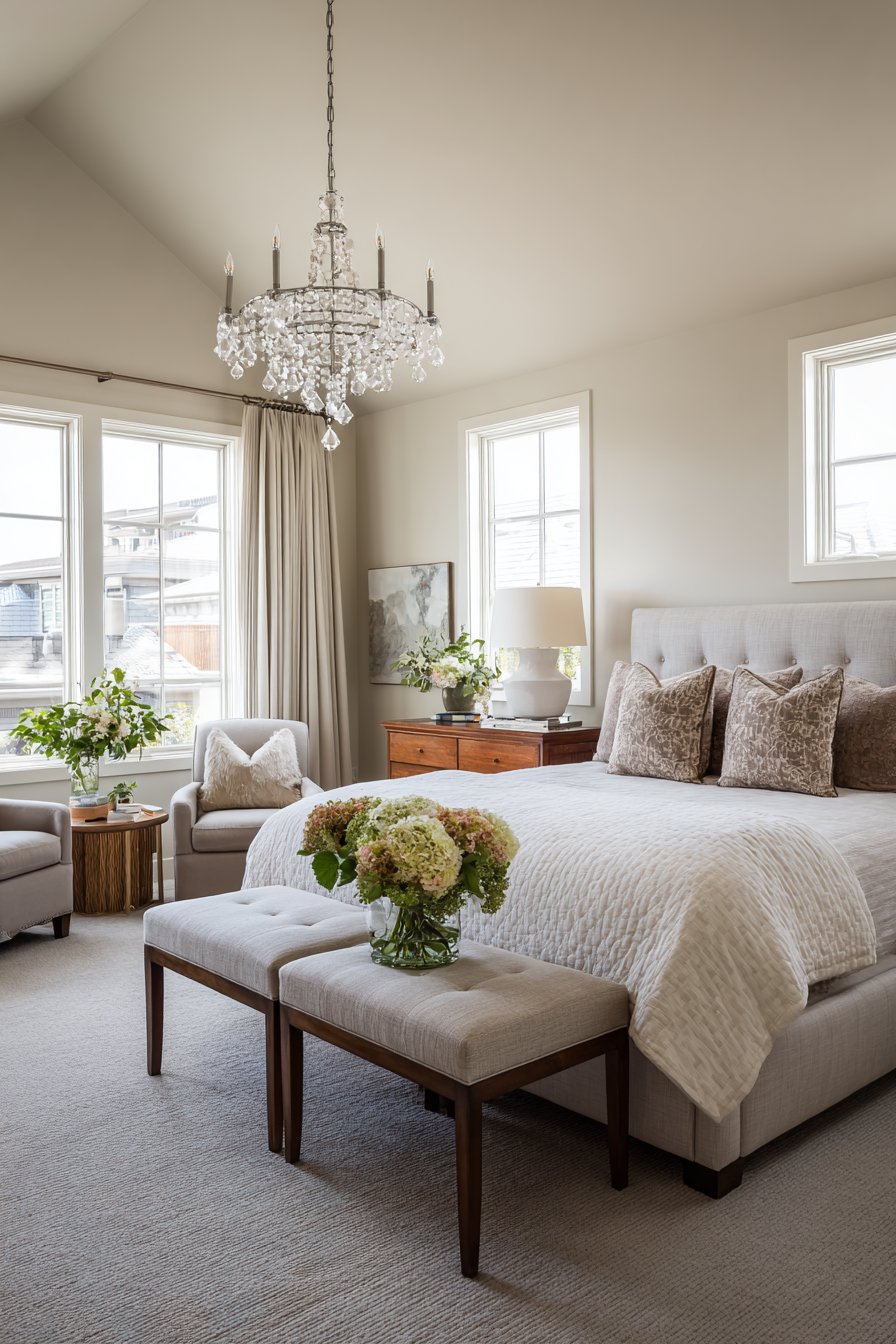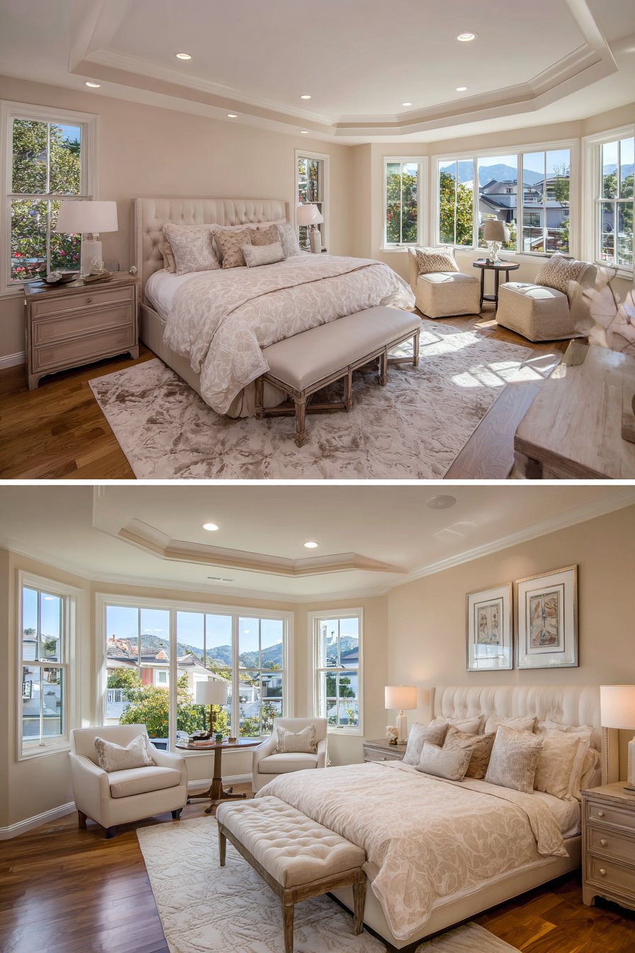 The neutral taupe and cream color scheme throughout unifies the various furniture groupings, preventing the square room from feeling chopped into disconnected areas. Natural lighting from multiple windows creates even illumination that enhances the room’s open, harmonious feel. This approach to California king bedroom layout demonstrates how proper planning creates flow and functionality, proving that good design is as much about what you place where as what you choose to place.
