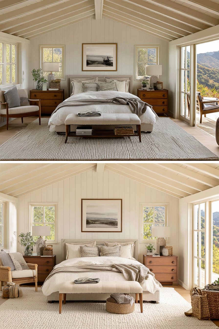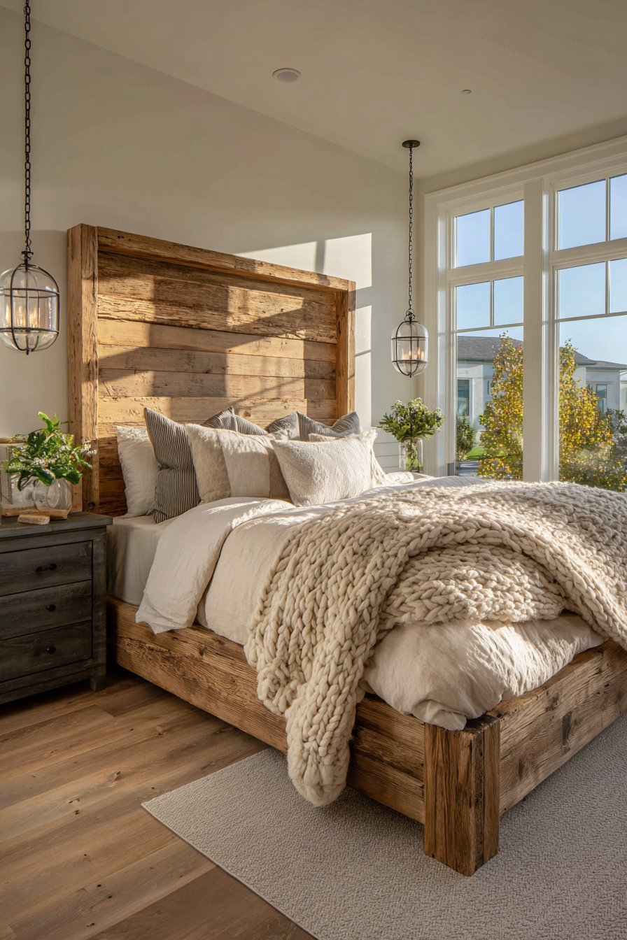 Golden hour lighting streaming through the windows transforms this space into something almost magical, as warm afternoon sun highlights the natural wood grain and creates long, gentle shadows that emphasize the room’s depth and architectural details. The farmhouse aesthetic succeeds because it prioritizes comfort and authenticity over perfection, creating a bedroom that feels lived-in and loved from day one—a space where you can truly relax and be yourself.