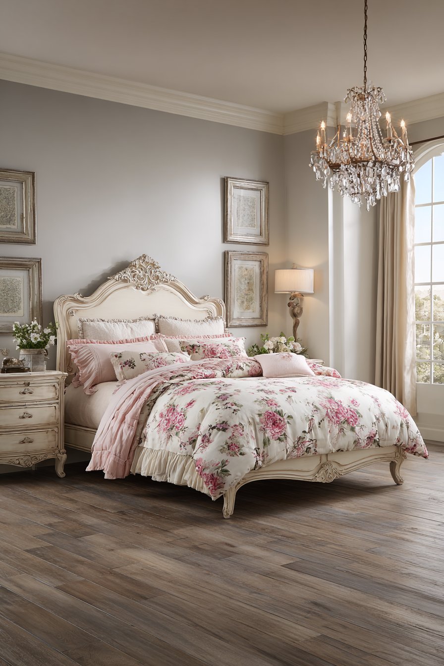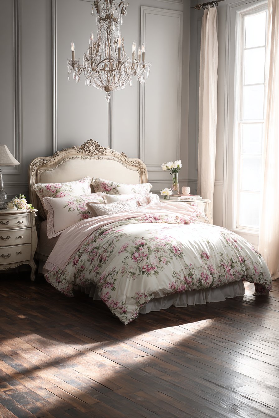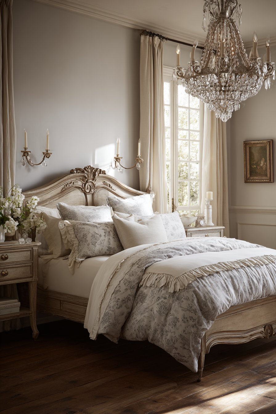 A crystal chandelier provides elegant ambient lighting, its sparkling prisms catching and refracting light throughout the space—a quintessentially French lighting choice that adds glamour without heaviness. Soft grey walls create the perfect neutral backdrop, allowing the ornate furniture and romantic textiles to shine while maintaining sophisticated restraint. Hardwood floors in warm honey tones ground the ethereal elements with natural warmth and organic texture.