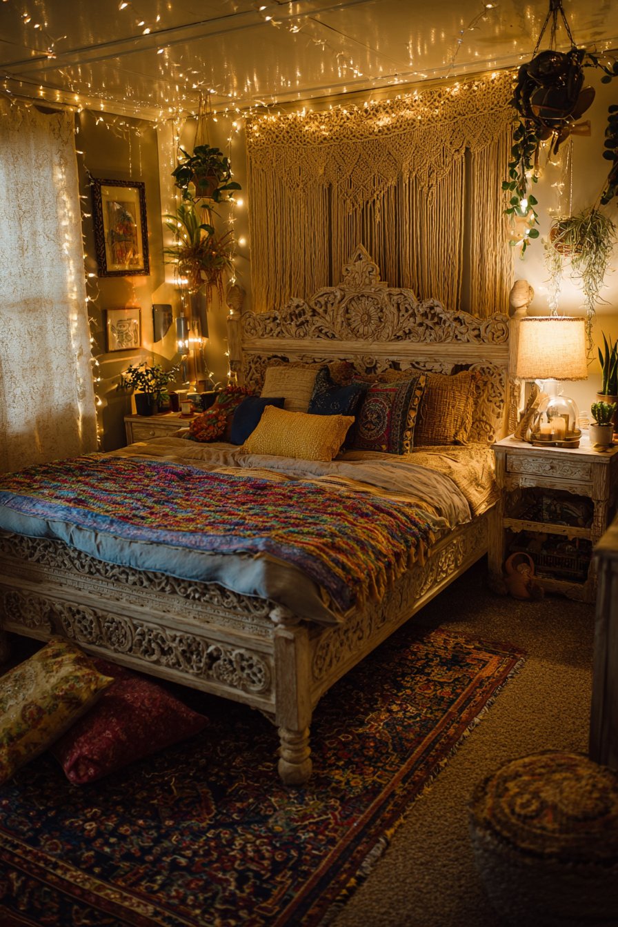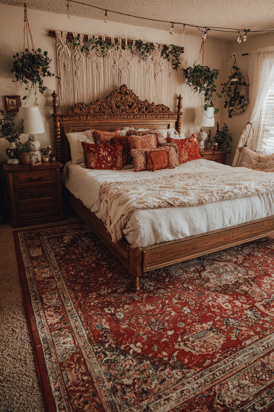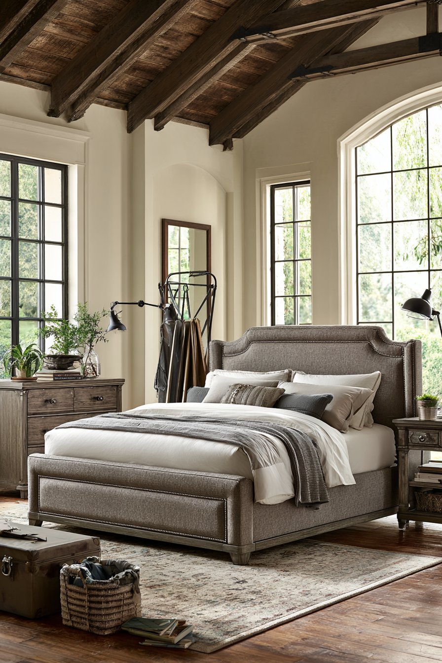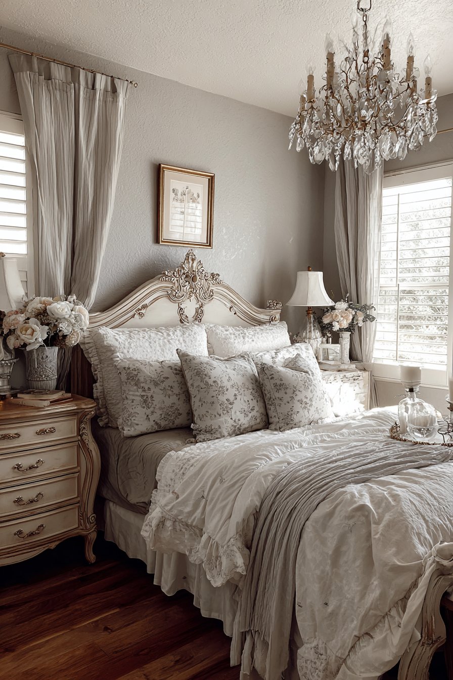 French country style brings Old World romance and timeless elegance to the California king bedroom through carved wood, soft colors, and delicate details. An ornate carved wooden headboard painted in distressed ivory becomes the room’s architectural focal point, its romantic curves and traditional craftsmanship evoking European countryside châteaux. The distressed finish suggests age and history, creating instant character that new furniture rarely achieves.