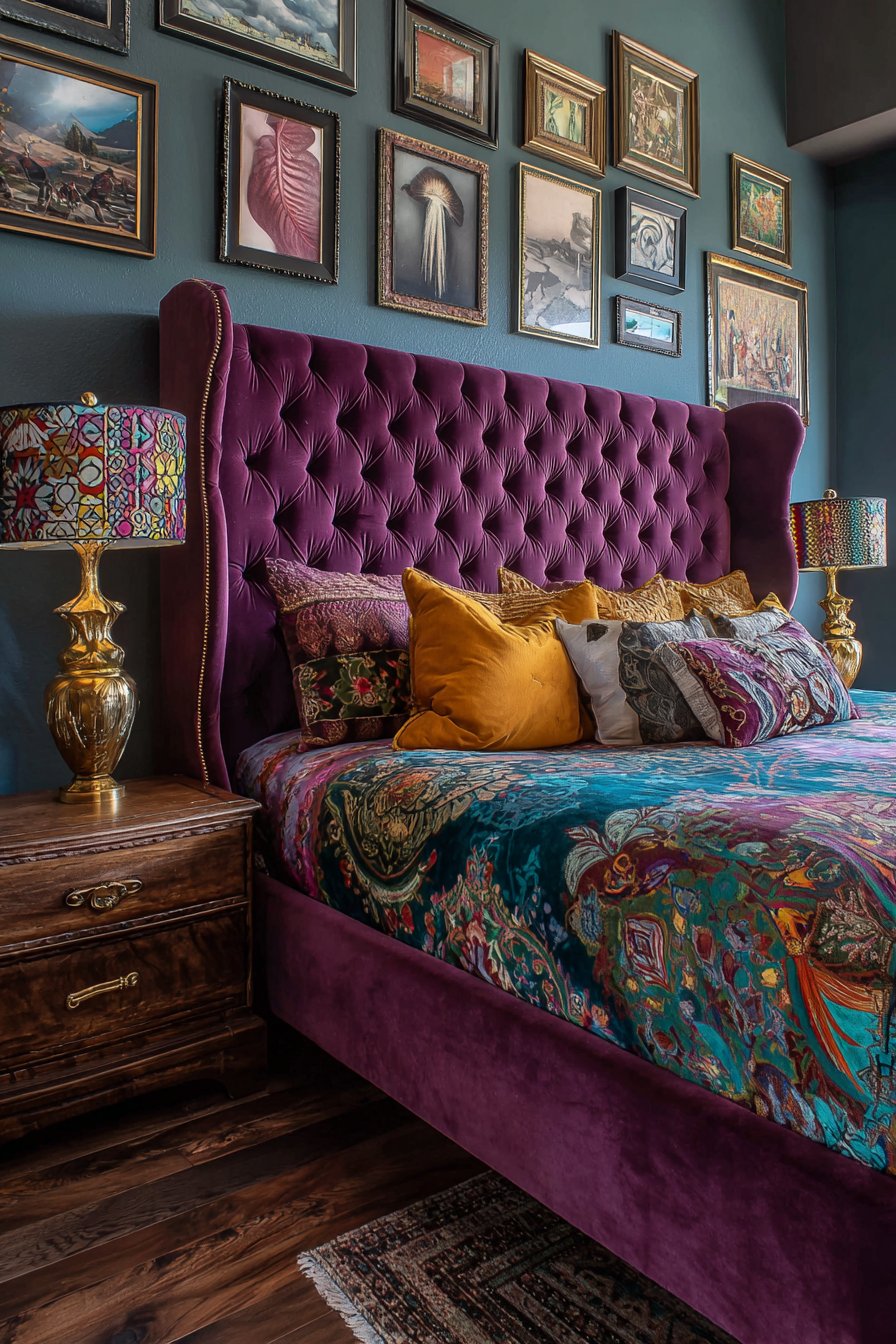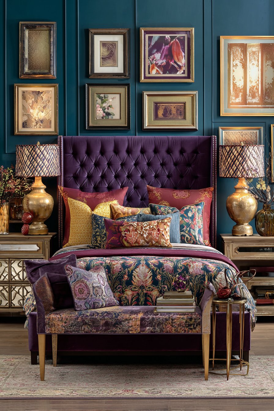 Crystal table lamps provide the finishing touch of luxury, their faceted bases creating prismatic light patterns that dance across walls and ceiling. Plush carpeting cushions every step, while floor-length curtains in coordinating tones frame the windows with theatrical elegance. This approach to California king bedroom design demonstrates how bold choices—particularly an investment headboard in a saturated color—can transform a standard bedroom into a personal five-star retreat.