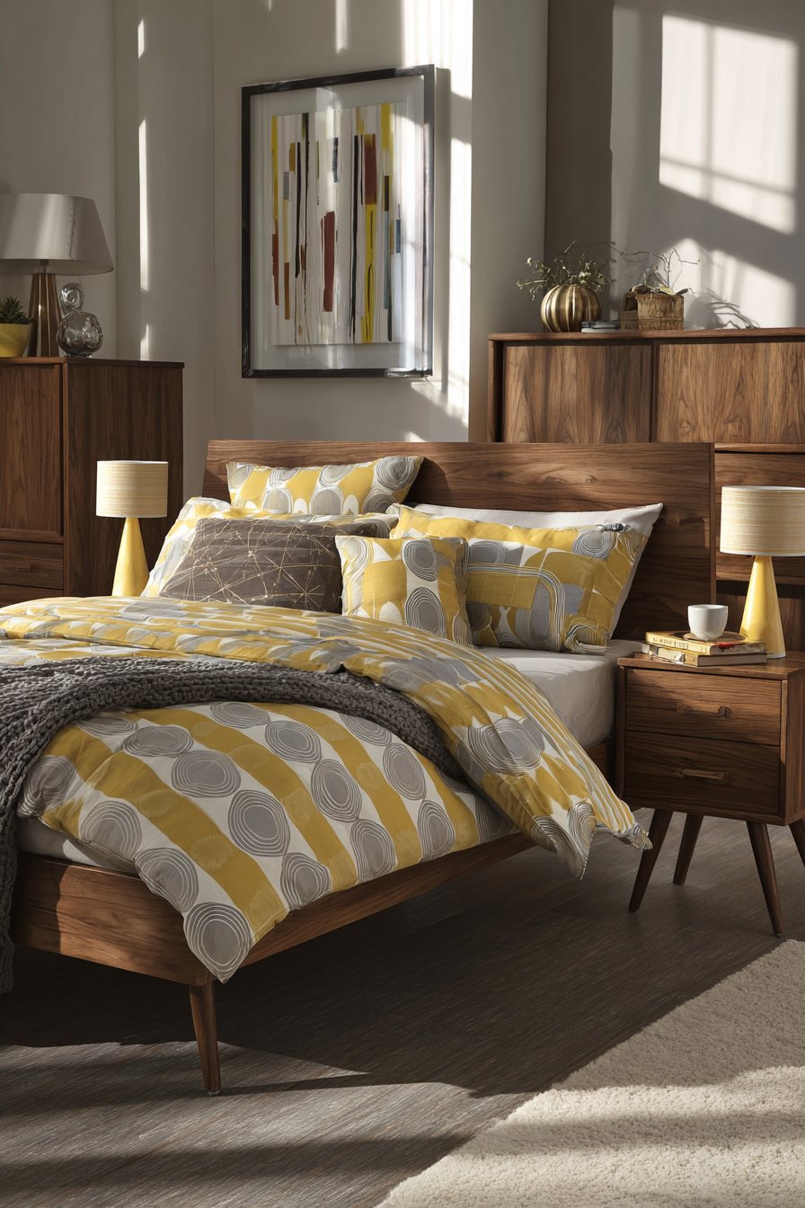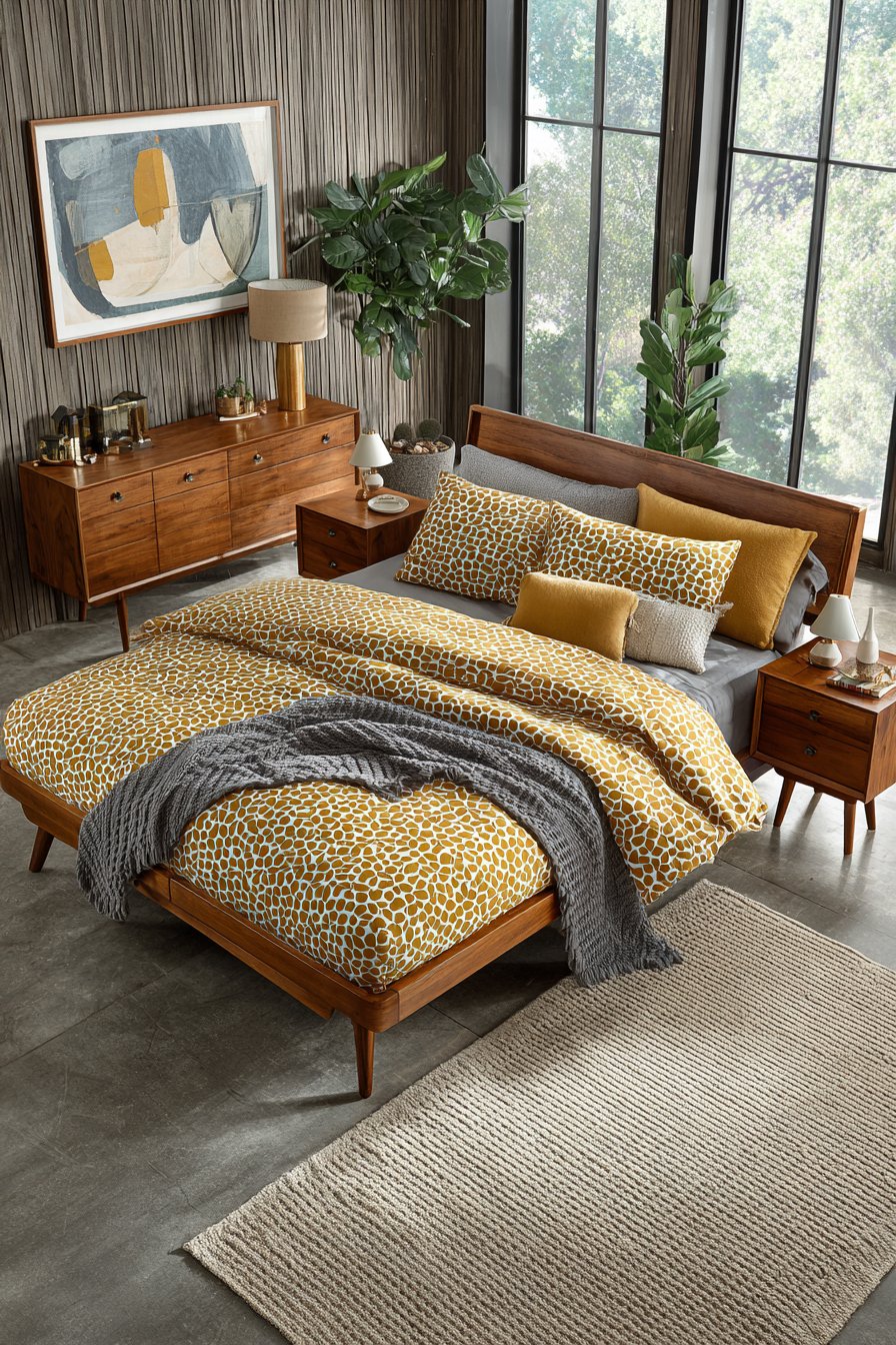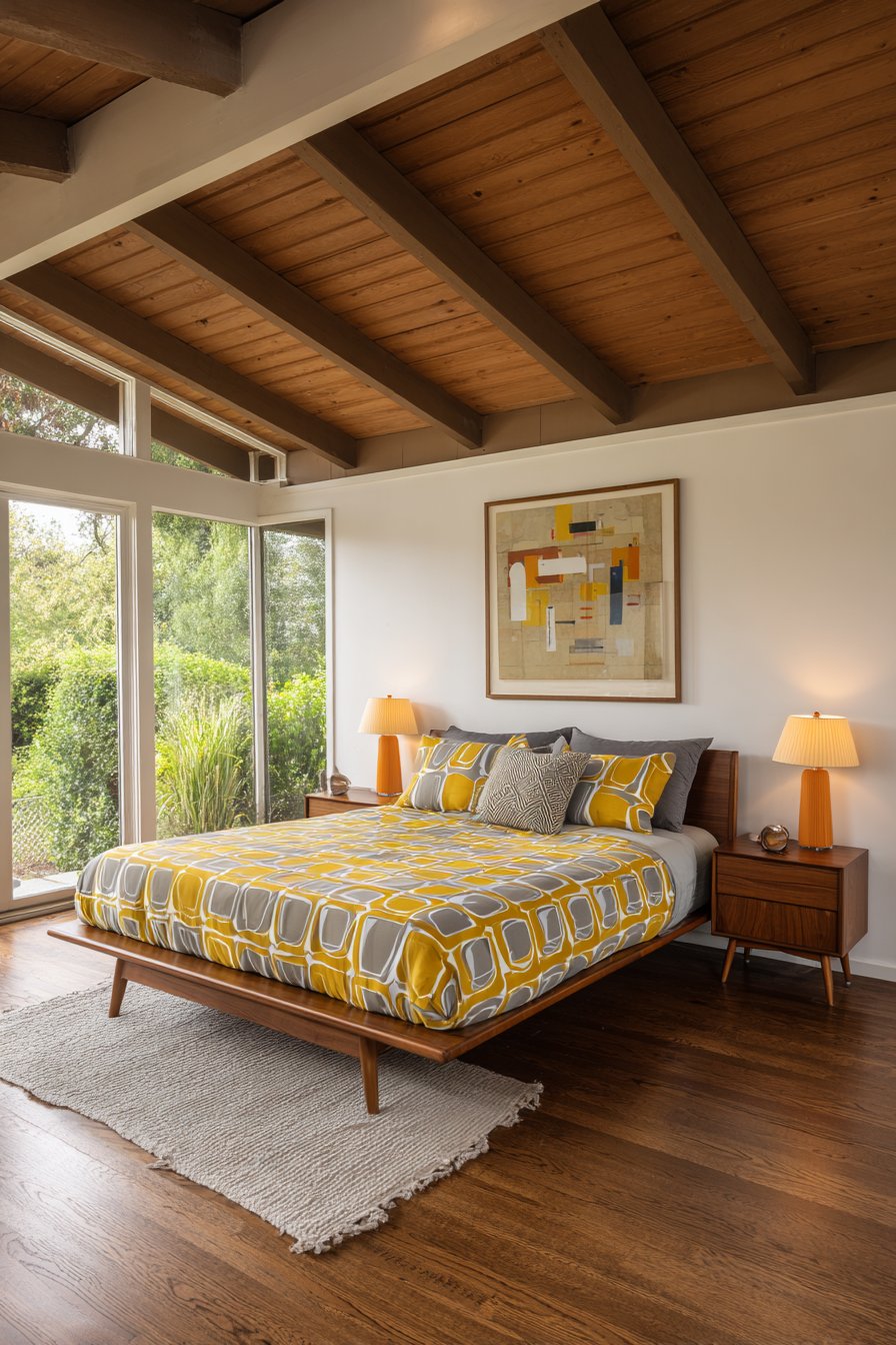 Dramatic lighting including wall sconces with geometric glass shades creates sophisticated illumination while contributing to the room’s distinctive period character. This Art Deco approach to California king bedroom design suits those who appreciate bold design, rich materials, and the sophisticated glamour of the 1920s and 30s—a time when design celebrated modernity through geometric forms and luxurious execution.