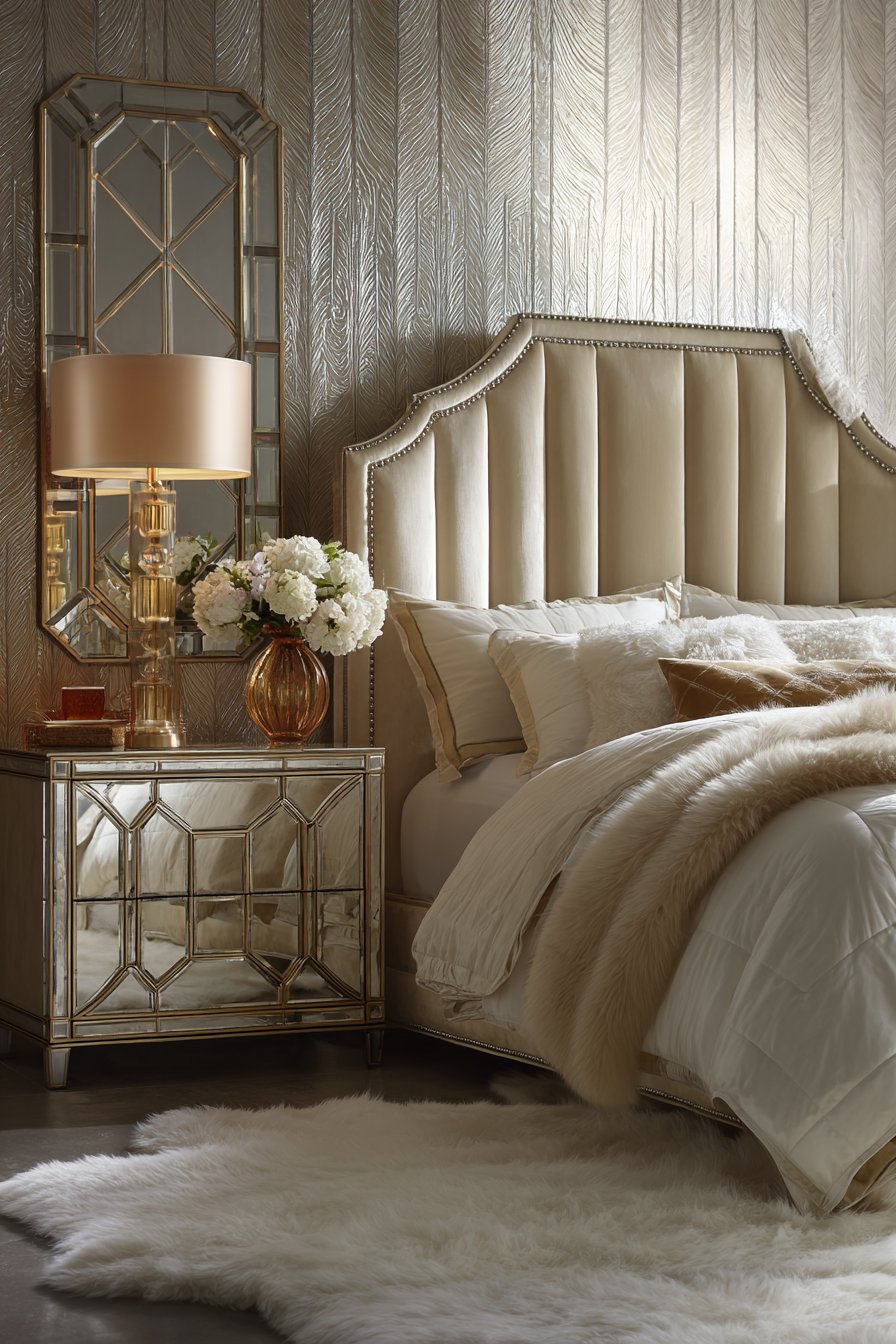 Luxurious bedding in silks and satins with metallic threading creates tactile richness and visual glamour, the smooth fabrics and metallic details catching and reflecting available light. Mirrored nightstands with beveled edges and gold-trimmed drawer pulls continue the glamorous aesthetic, their reflective surfaces and geometric details quintessentially Art Deco. A black and white geometric area rug grounds the space, its bold pattern providing the graphic impact that defines the style.