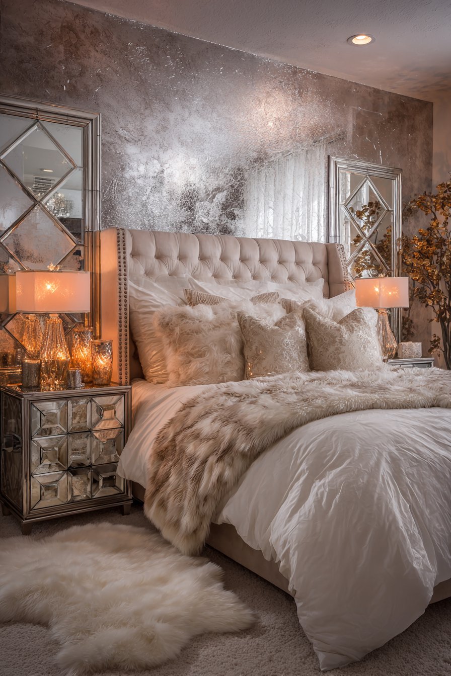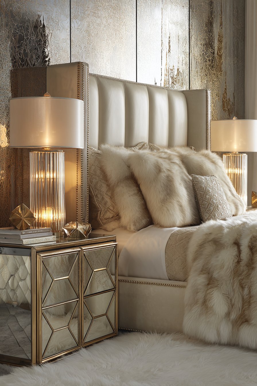- Incorporate metallic finishes extensively—gold, chrome, brass