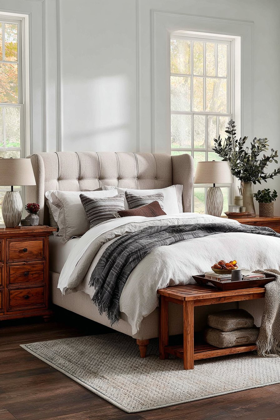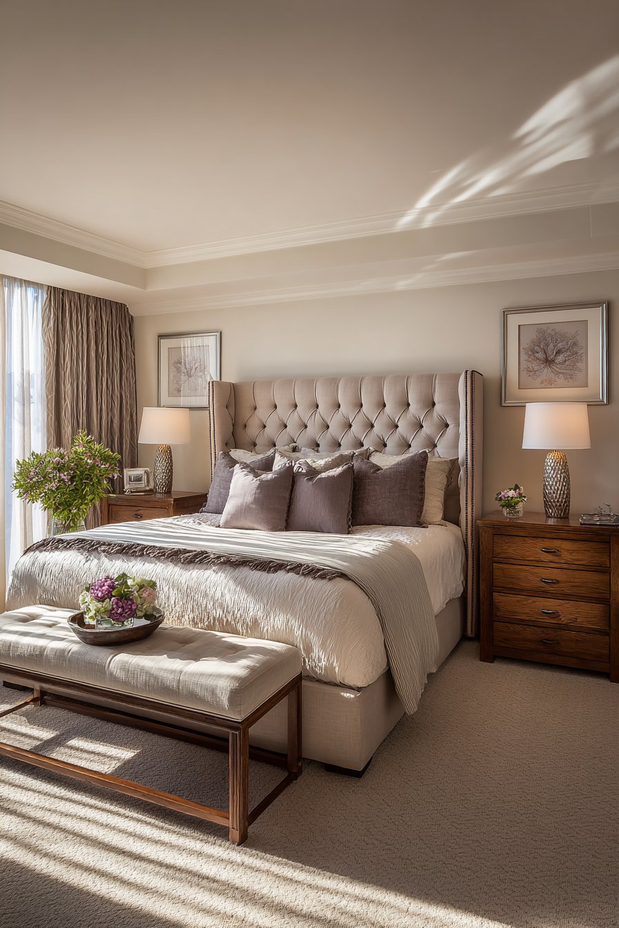 Transitional design strikes the perfect balance between traditional comfort and contemporary sensibility, creating spaces that feel both current and enduring. This California king bedroom showcases a substantial upholstered bed frame featuring a tall wingback headboard in neutral beige linen, its traditional silhouette softened by clean modern lines. The bed becomes an inviting focal point, dressed in layers of hotel-quality bedding that combine crisp whites with soft greys, creating depth through tonal variation rather than pattern.