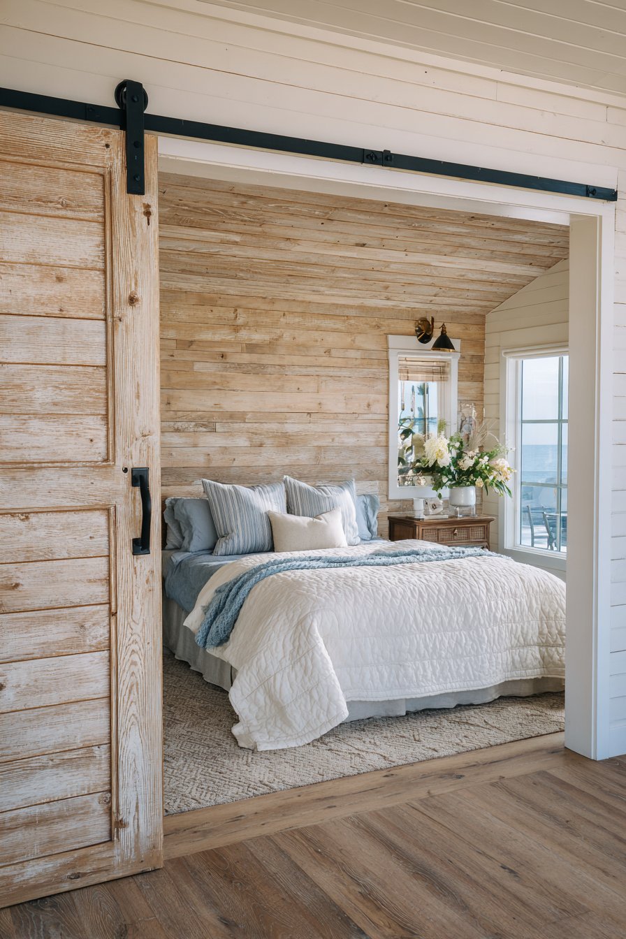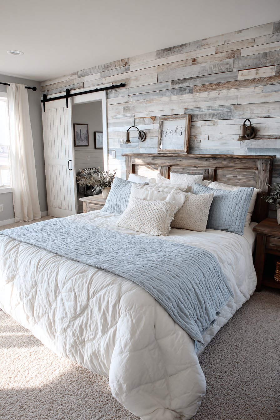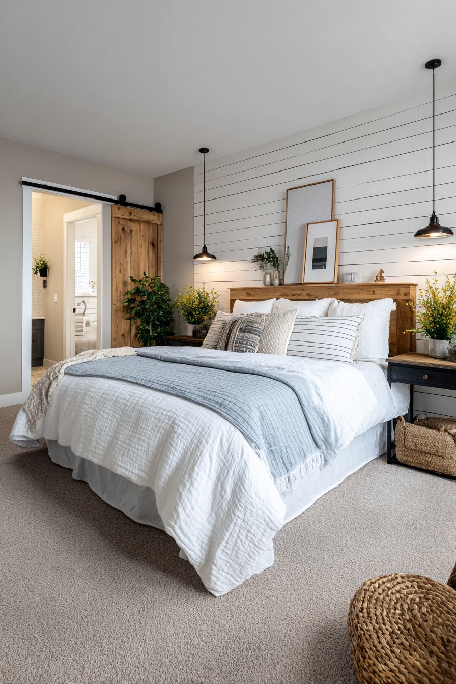 Layered bedding in whites and soft blues with quilted coverlet adds casual elegance, the combination of crisp and soft textures creating inviting comfort. Black metal and wood nightstands provide industrial contrast, their mixed materials and streamlined forms bringing contemporary edge to the farmhouse foundation. A sliding barn door leading to the ensuite bathroom adds authentic farmhouse architecture while saving space compared to traditional swinging doors.