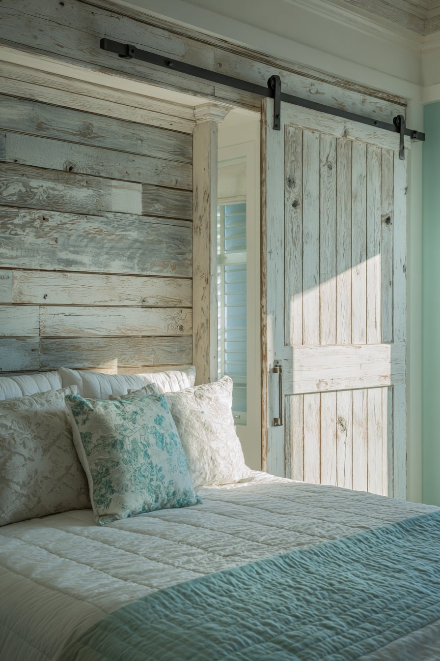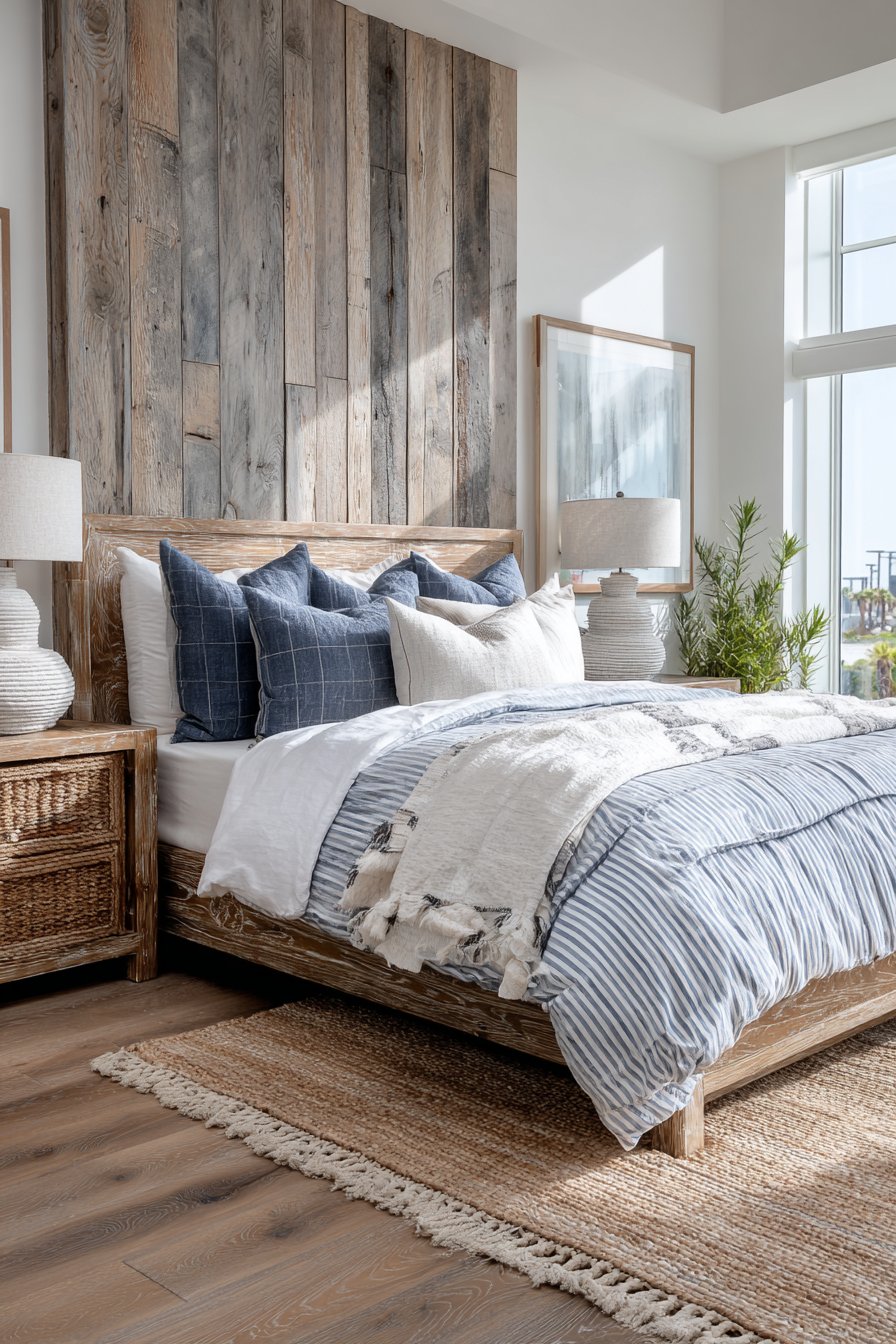 The coastal bedroom transports you to seaside vacations every single day, creating a perpetual retreat from daily stress through carefully curated beach-inspired elements. A whitewashed wooden California king bed frame and matching shiplap feature wall evoke weathered boardwalks and driftwood, their pale, sun-bleached appearance immediately establishing the room’s relaxed, vacation-home character. The textured wood surfaces catch and reflect light in subtle ways, creating visual interest through natural variation rather than applied decoration.