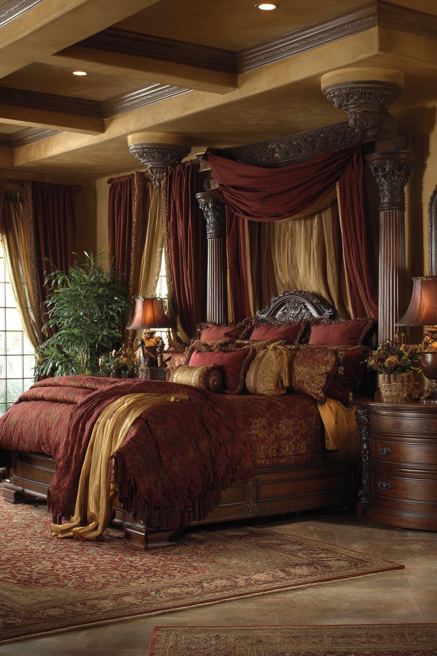 Rich jewel-tone bedding in burgundy and gold conveys traditional elegance and opulent luxury, the saturated colors and sumptuous fabrics reflecting classical design’s embrace of richness and ornament. Substantial nightstands with multiple drawers provide the generous storage traditional design demands, their quality construction and detailed craftsmanship evident in dovetail joinery and solid wood construction. A Persian rug in complementary colors anchors the space, its intricate patterns and rich colors providing the foundation traditional rooms require.