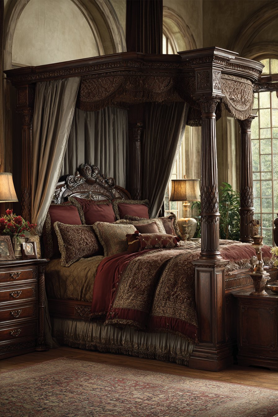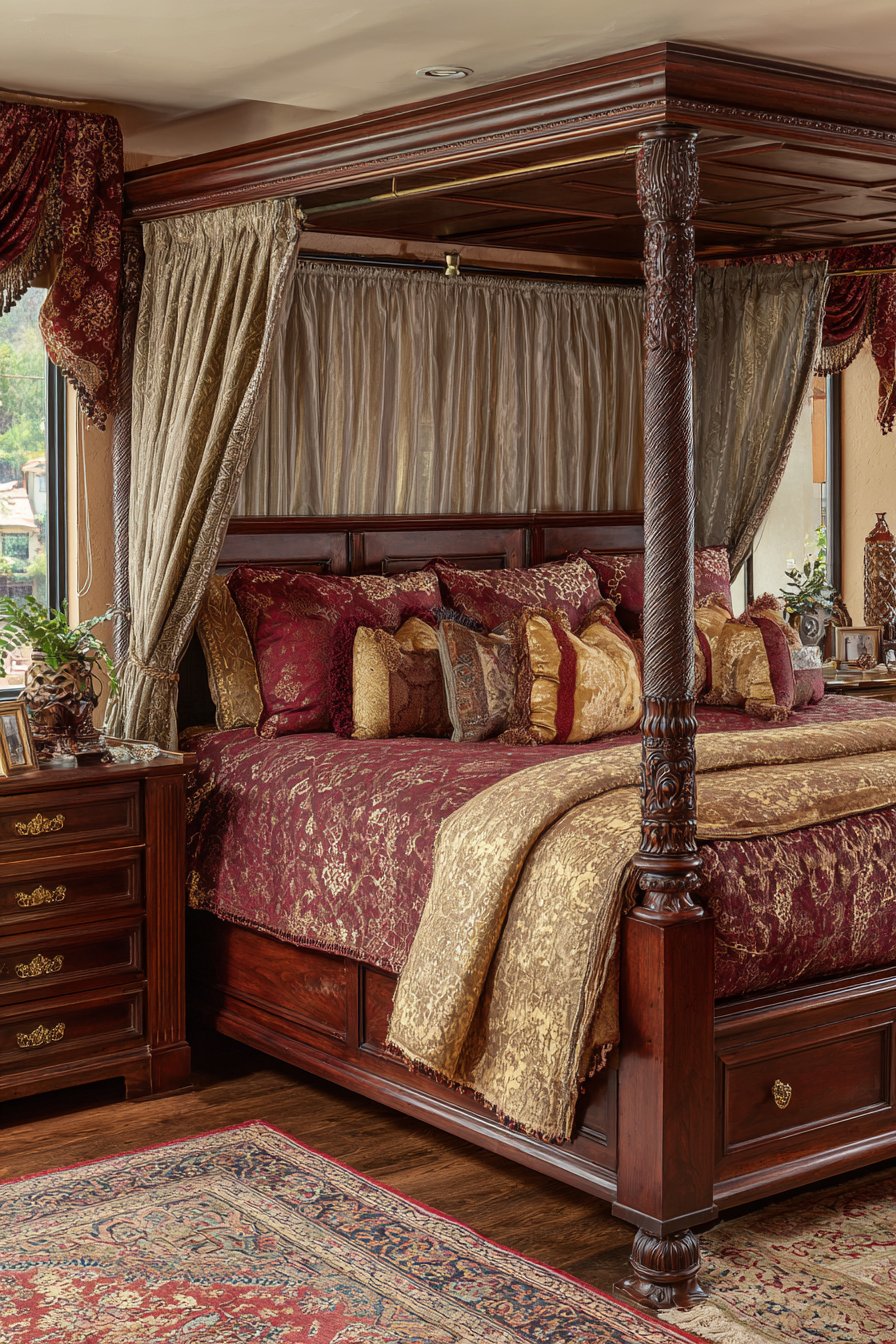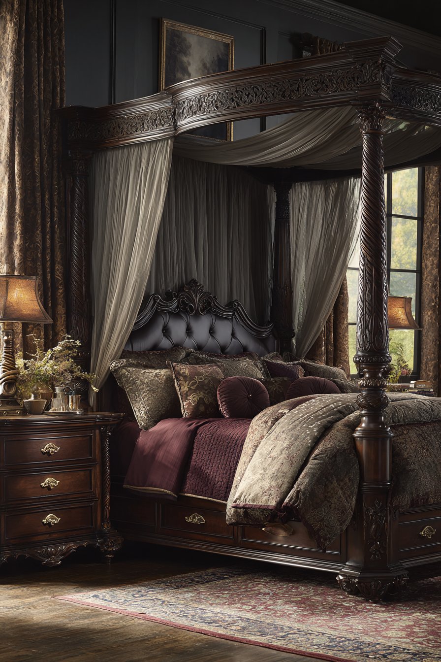 Traditional design brings formal elegance and rich materials to the California king bedroom through quality craftsmanship and timeless proportions. A California king four-poster bed in dark mahogany wood with tall carved posts creates impressive architecture within the room, the substantial posts framing the sleeping space and creating intimate enclosure. Draped sheer fabric panels between the posts create romantic canopy effect, the flowing textiles adding softness and movement to the substantial wood structure.