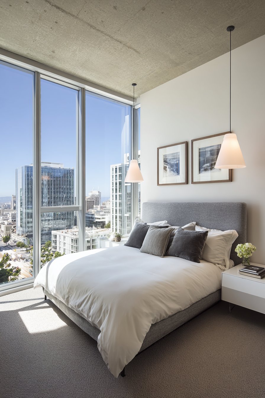 White walls maximize light reflection, ensuring the abundant natural daylight penetrates throughout the space and keeps the room feeling bright despite the urban density surrounding it. This urban loft approach to California king bedroom design suits city dwellers who embrace their urban location—those who view the city itself as part of their home’s aesthetic and want their interior design to celebrate rather than deny their metropolitan context.