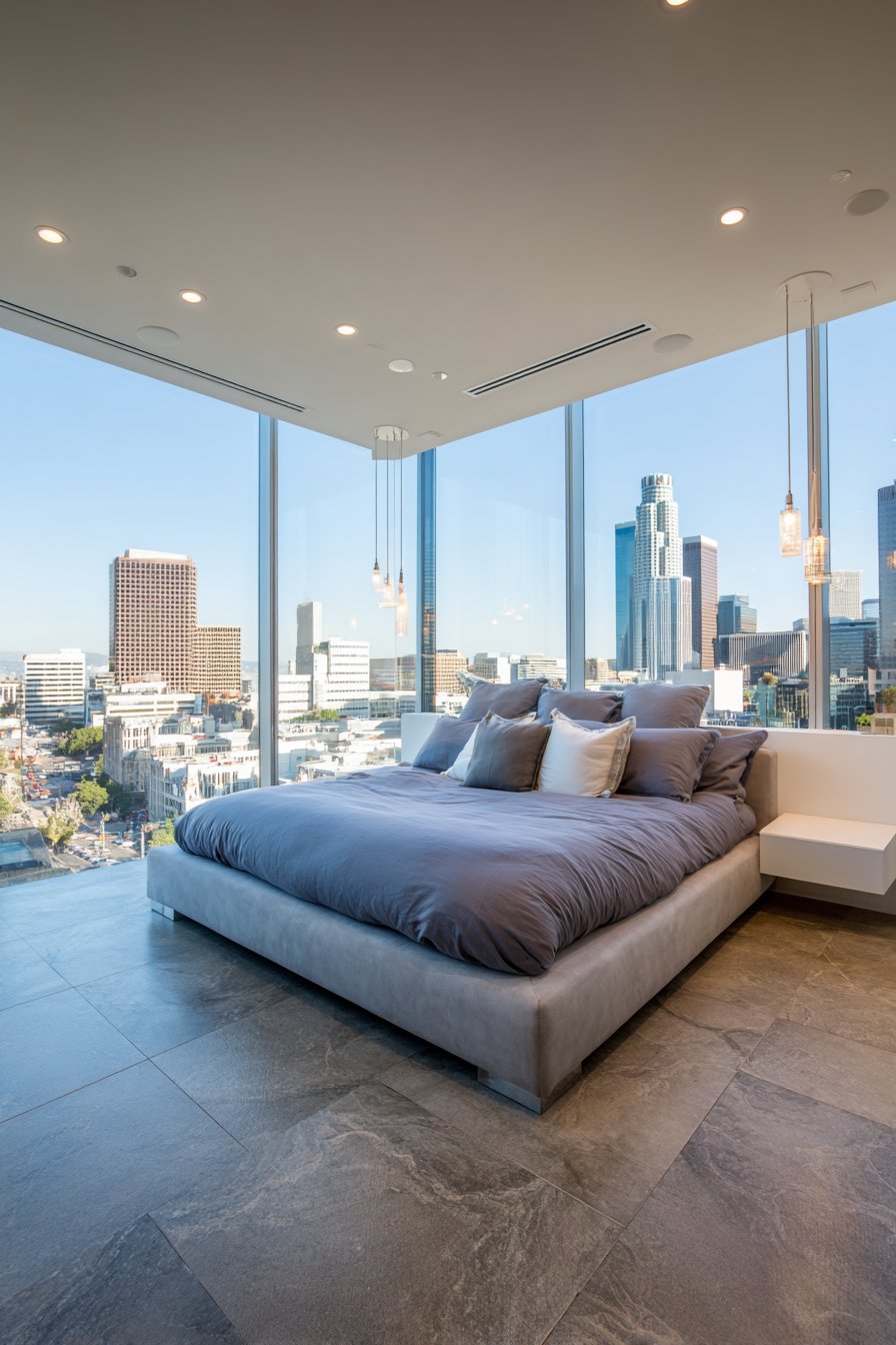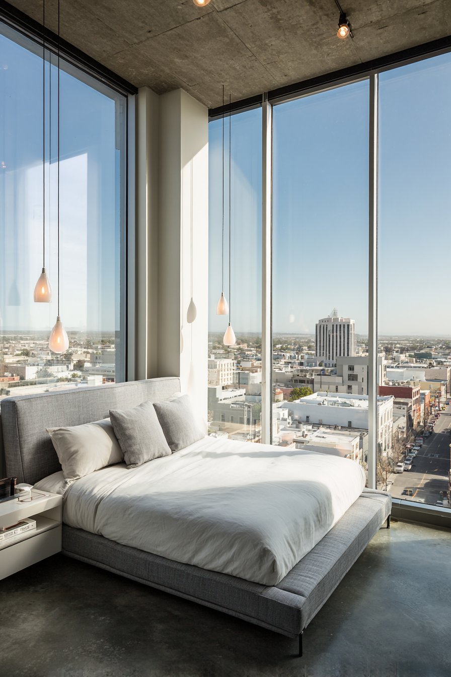 Urban loft design celebrates city living through industrial elements, abundant light, and connection to surrounding cityscape. A California king bed on a simple metal frame positioned against floor-to-ceiling windows maximizes views of urban landscapes, the minimal bed frame ensuring the dramatic city vistas remain the focal point. A modern grey upholstered headboard provides comfortable support for reading without blocking precious window area or obstructing the connection to outdoor environment.