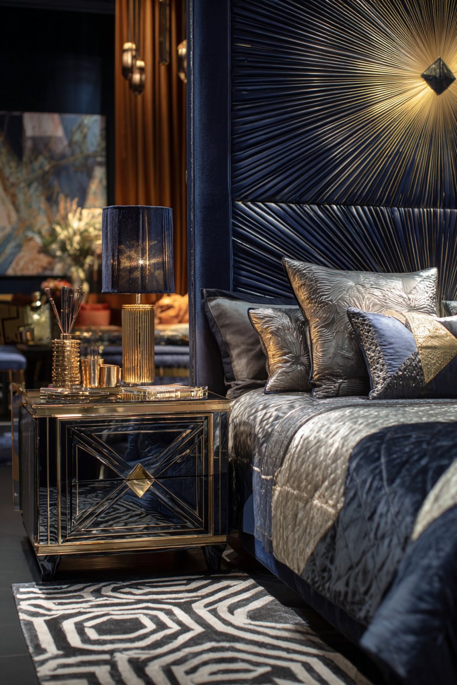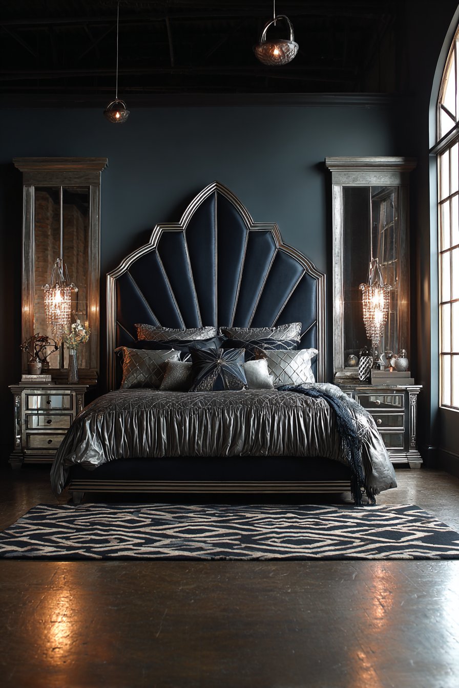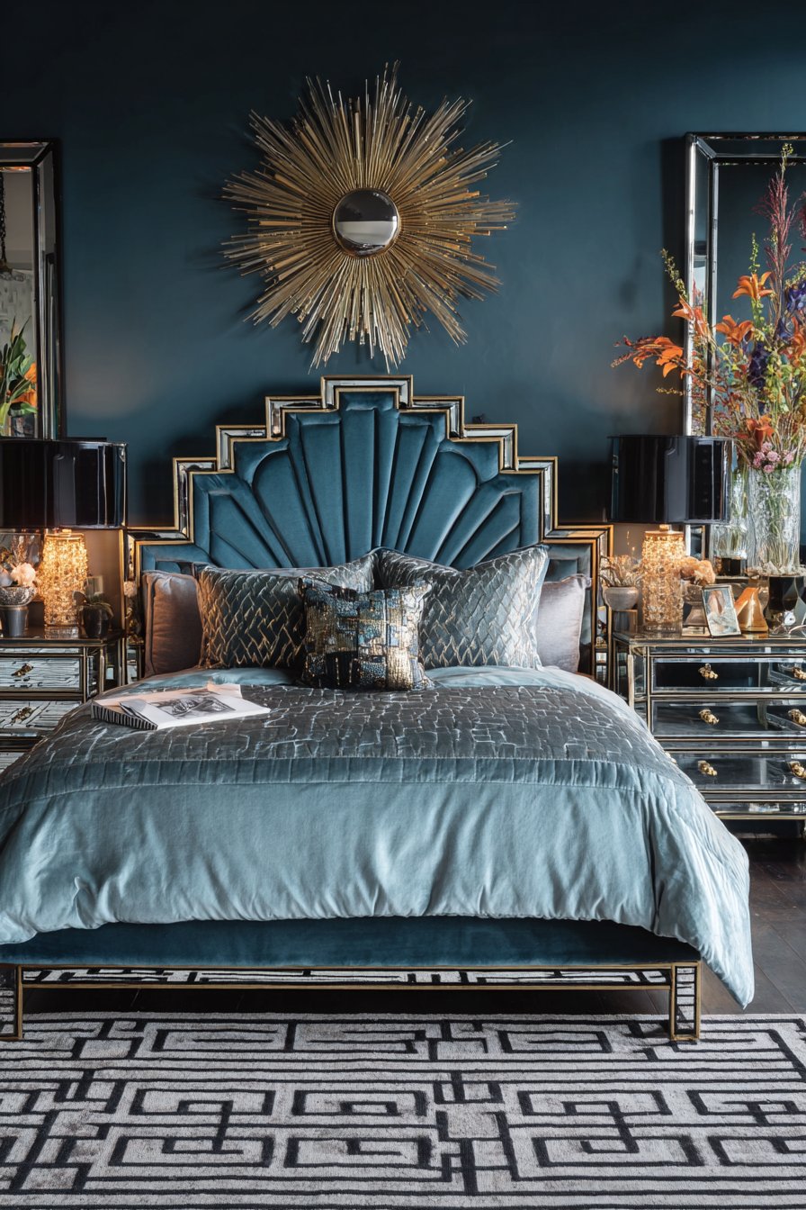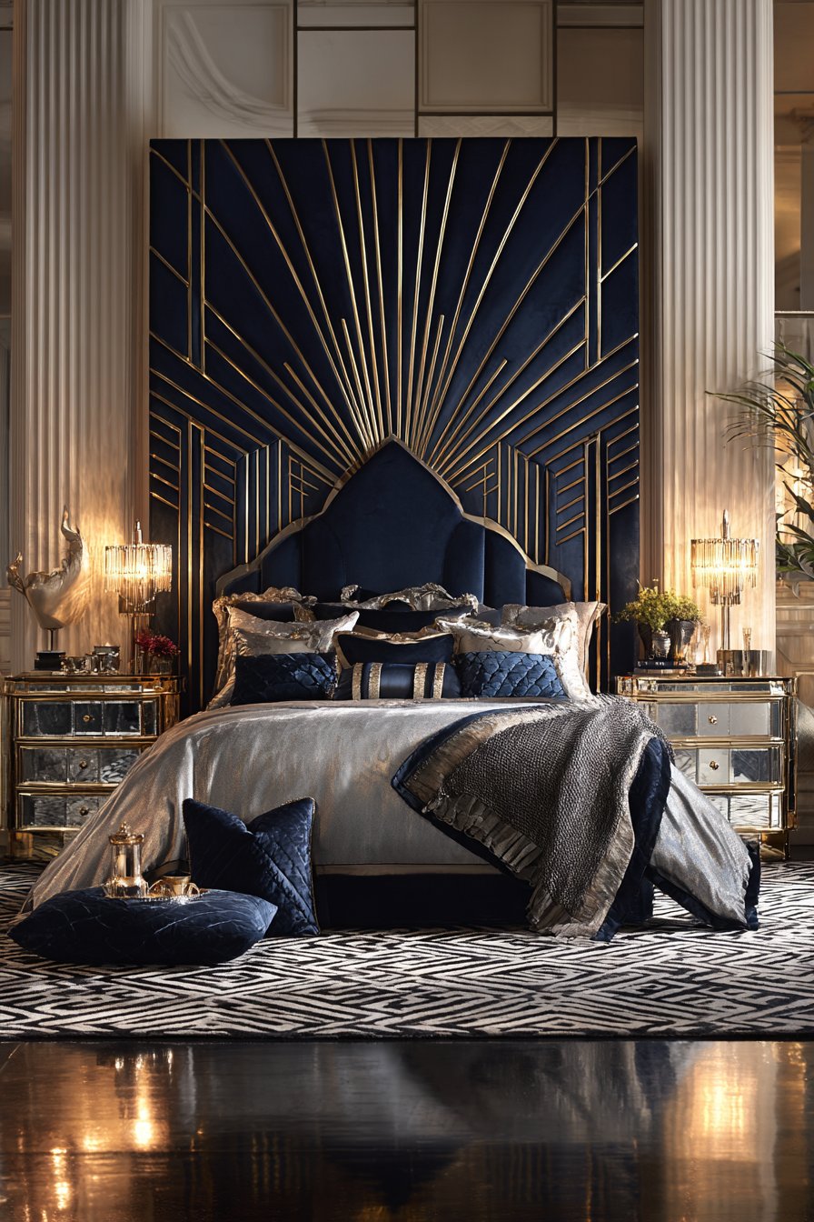 Art Deco design brings Jazz Age glamour and geometric sophistication to the California king bedroom through bold shapes and luxurious materials. A California king bed featuring a geometric sunburst headboard in lacquered navy blue with gold accents creates immediate visual impact, the symmetrical radiating design and contrasting colors embodying the style’s bold graphic sensibility. The high-gloss lacquer finish reflects light dramatically, creating dimensional depth and luxurious shine.
