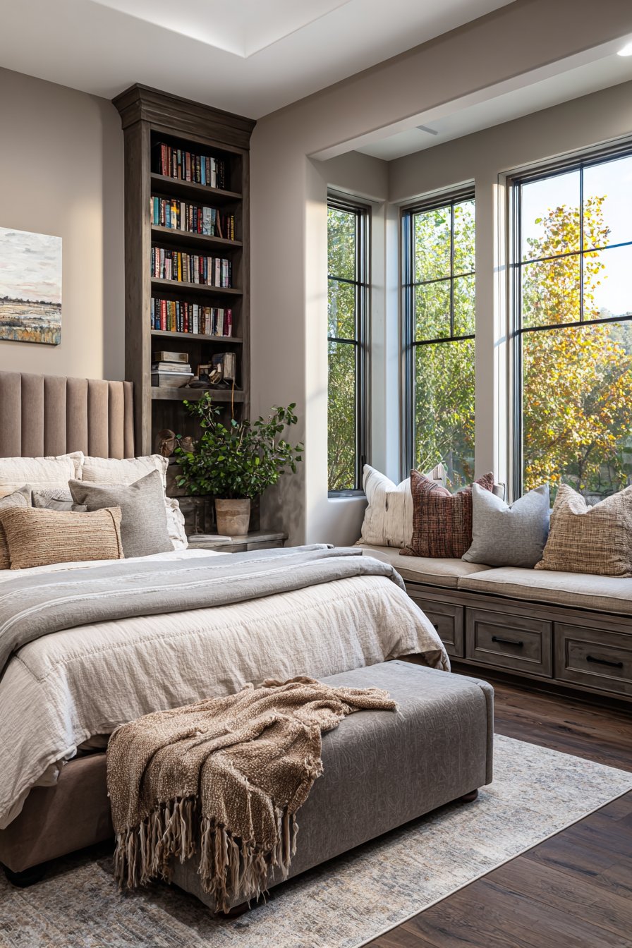 Soft neutral bedding and layered throw blankets invite relaxation, the tactile comfort promising hours of peaceful reading either in bed or on the window seat. Multiple lighting options including overhead ambient light, bedside reading lamps, and perhaps a floor lamp near the window seat ensure appropriate illumination for reading regardless of time or natural light conditions. This approach to California king bedroom design creates true personal retreat—a space dedicated to the simple pleasure of reading.