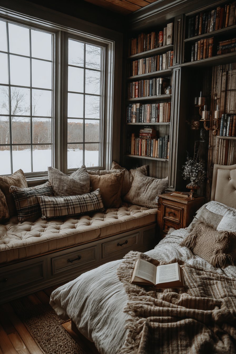 A built-in window seat with storage drawers creates additional seating for daytime reading, the abundant natural light making this the ideal spot for afternoon book immersion. Floor-to-ceiling bookshelves flank the bed, serving as alternative nightstands while displaying personal library collections that transform the bedroom into literary sanctuary. The integrated shelving eliminates the need for separate bookcases while keeping favorite volumes within easy reach.