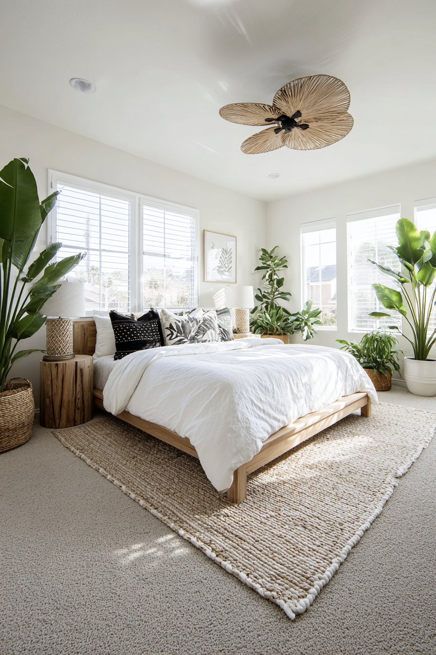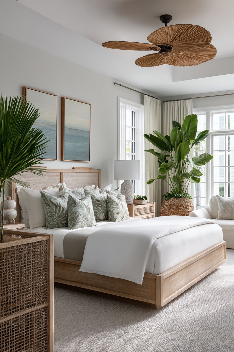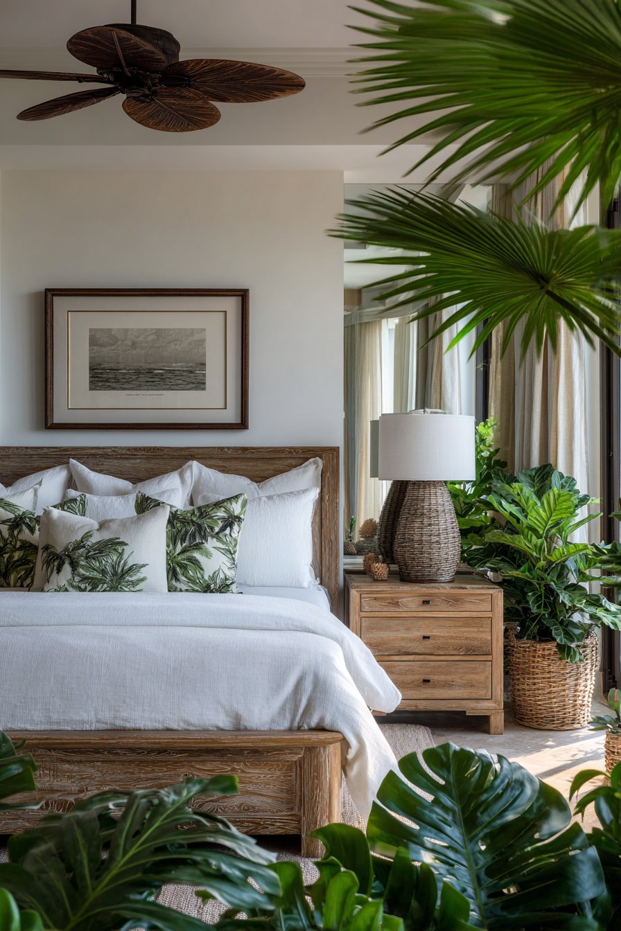 Woven seagrass nightstands display ceramic lamps with palm leaf motifs, their natural fiber construction and tropical details reinforcing the resort aesthetic while maintaining sophisticated restraint. Large potted plants including bird of paradise and monstera bring substantial indoor greenery, their dramatic leaves and tropical origins transforming the bedroom into verdant retreat. The plants also improve air quality while connecting the indoor space to natural outdoor environments.